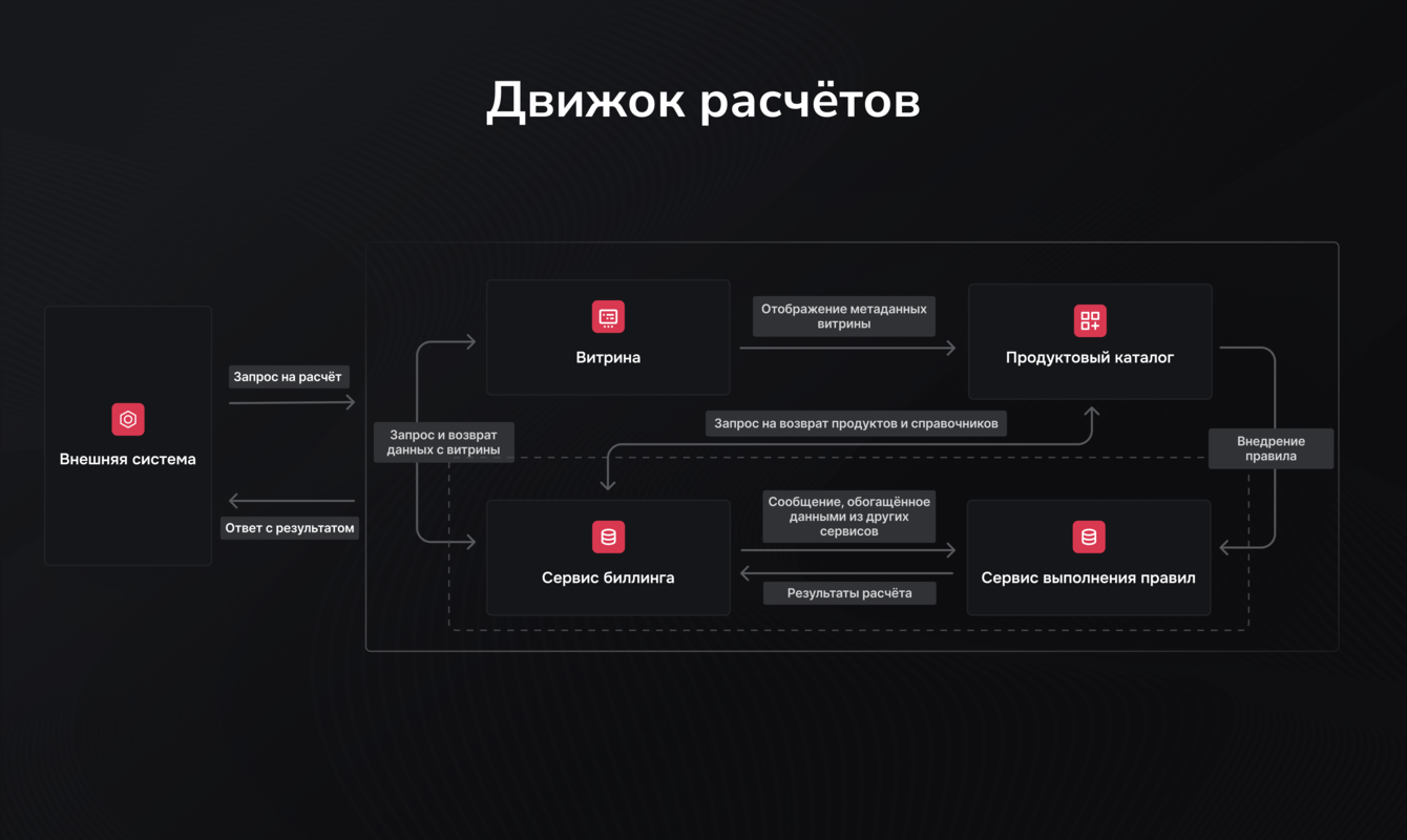 Billing/движок расчётов — модуль, который исполняет правила: принимает запрос из цифрового канала или внутренней системы, определяет нужный продукт, подтягивает условия из конструктора, данные из витрины и возвращает рассчитанное значение. Например, комиссию, процентную ставку или баллы лояльности.