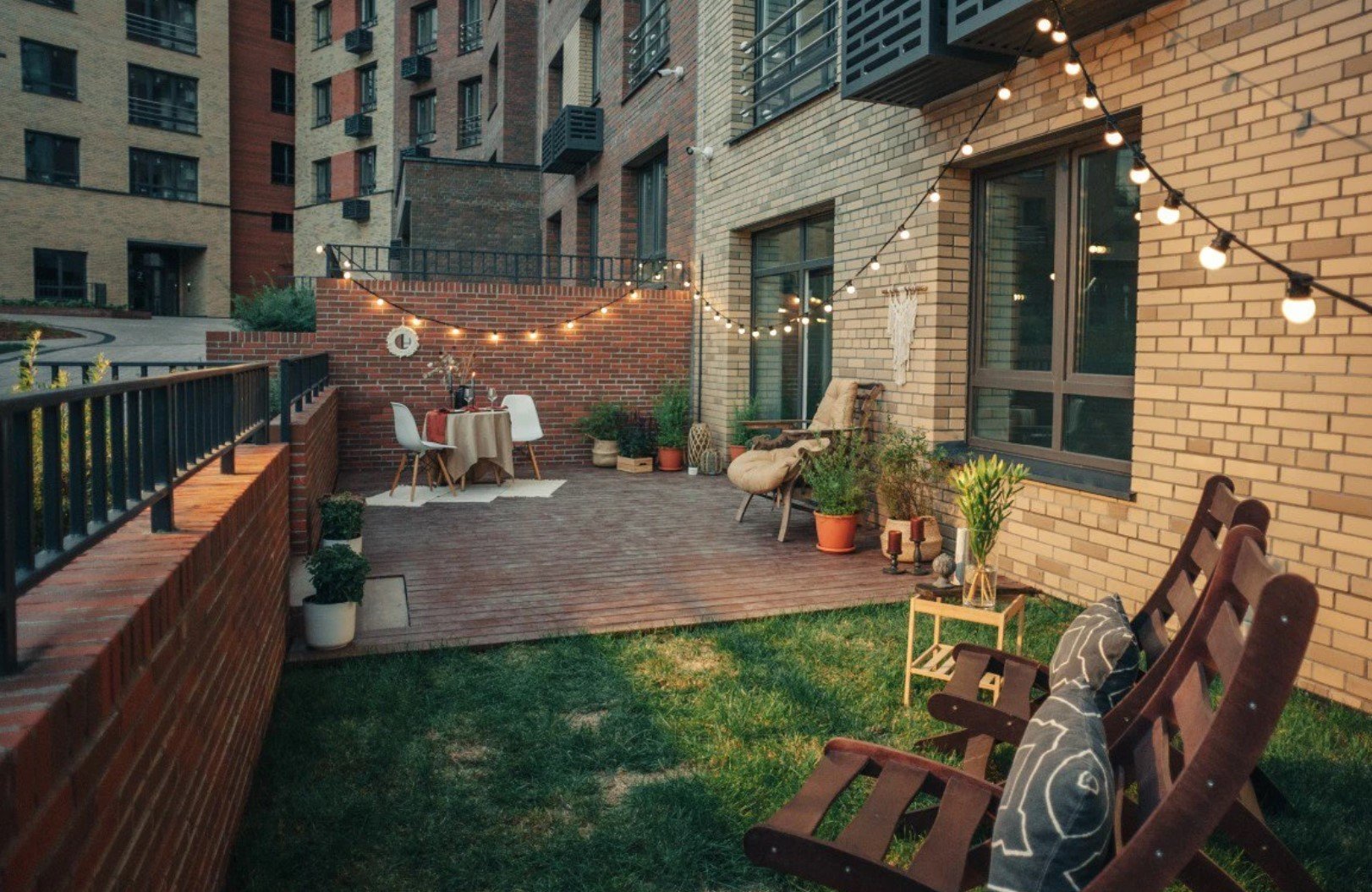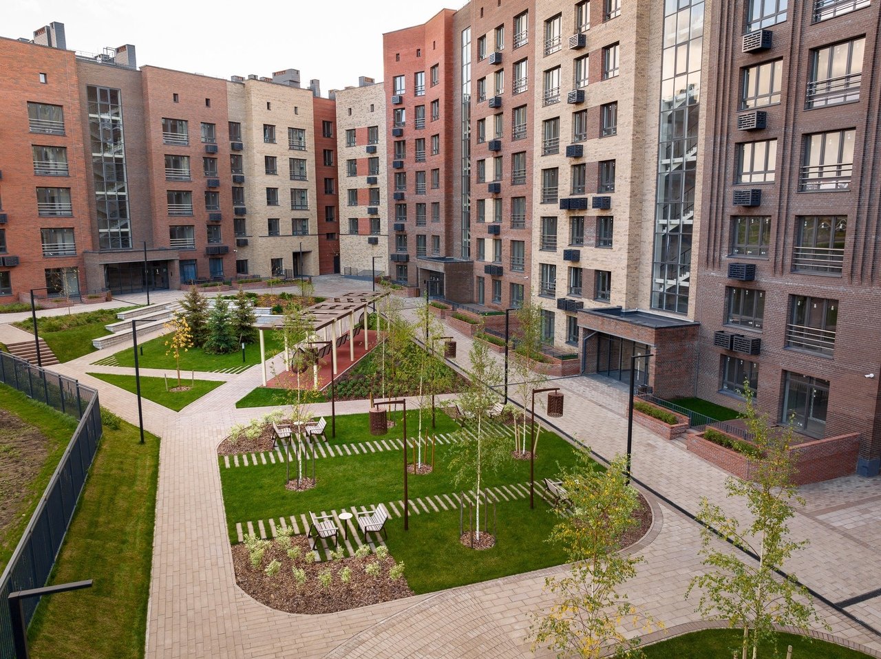 Предложено решение по созданию собственных террас для квартир, расположенных на первых этажах с выходом на внутреннюю территорию дома, чтобы повысить их привлекательность. Одновременно квартира получает собственный вход (можно попасть внутрь напрямую через террасу, минуя подъезд.