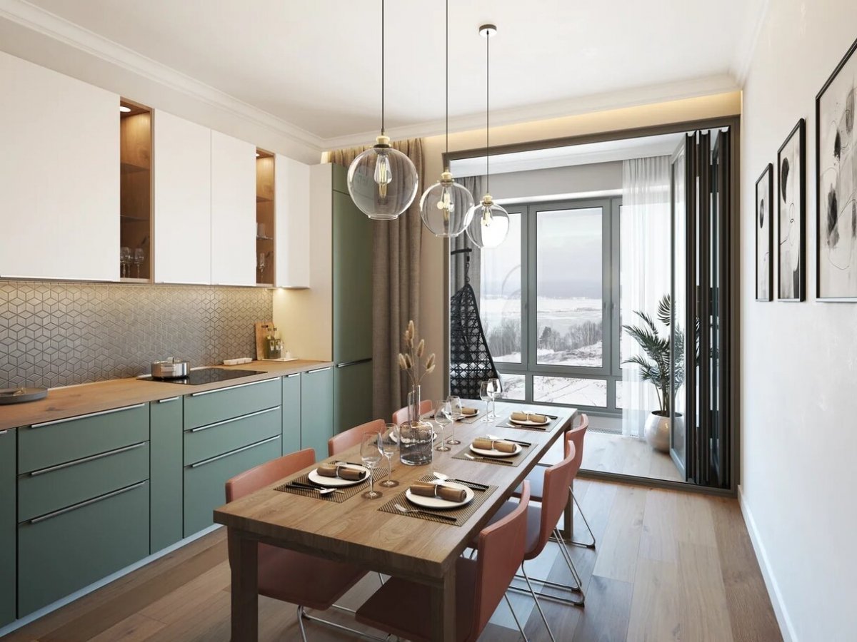 Предложена концепция остекления балконов в пол + отказ от решений с подоконниками внутри квартиры, вместо этого предложено внедрить раздвижные оконные перегородки, которые позволяют при их полном открытии объединить визуально пространство комнаты и балкона.