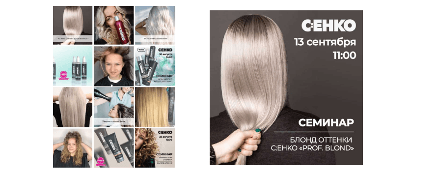 Особое внимание уделяется афишам семинаров, которые проводит бренд для парикмахеров. Они яркие и, в то же время, информативные.