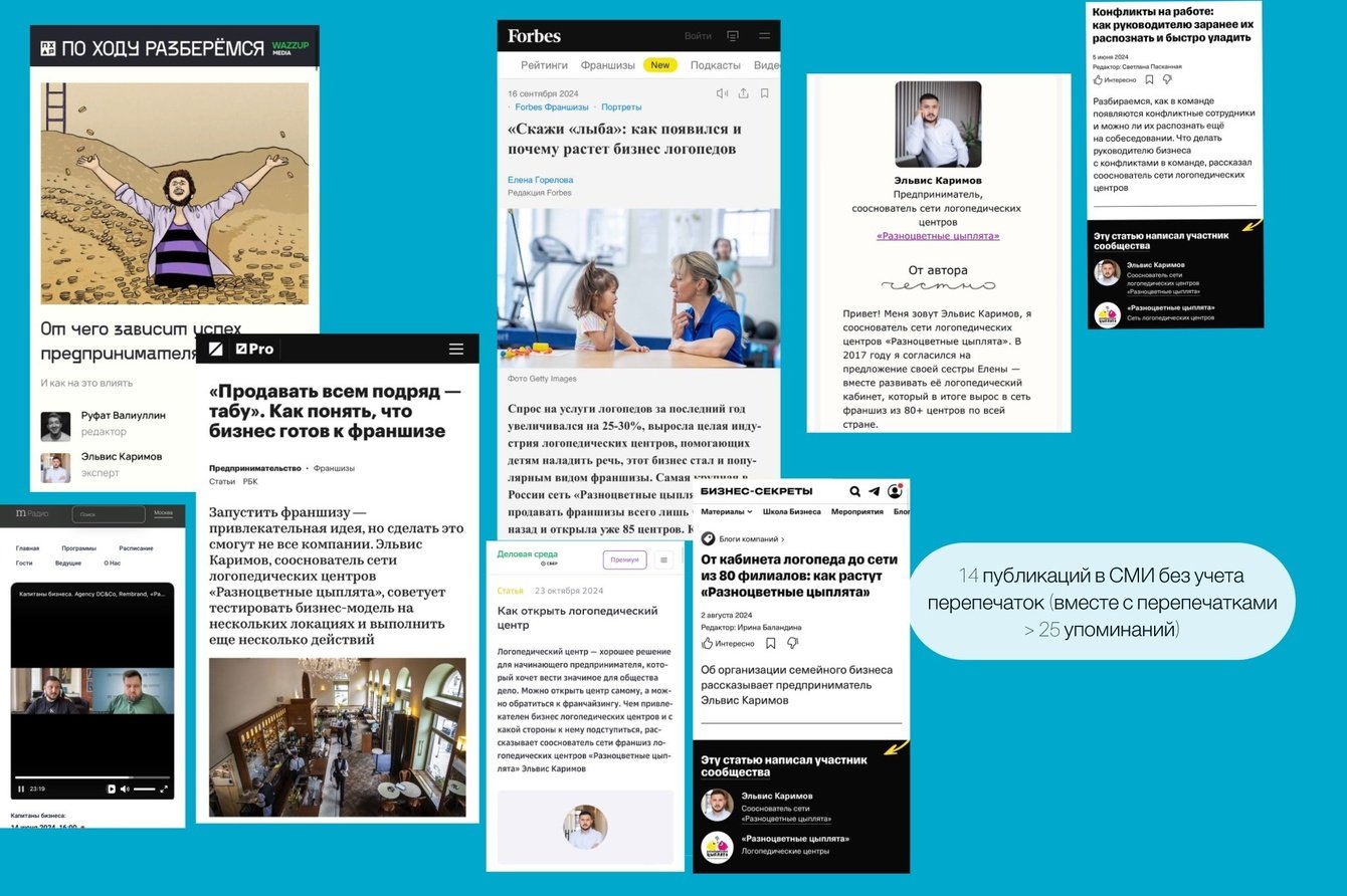 В деловых СМИ мы активно рассказывали о том, как выбрать франшизу и на что обратить внимание: в Деловой Среде написали с сооснователем компании подробный гайд о том, как открыть логопедический центр, в Бизнес-секретах рассказали, как сеть выросла из одного центра в Санкт-Петербурге до сети >80 центров, организовали участие спикера в эфире радио Медиаметрикс "Капитаны бизнеса", в РБК написали колонку о том, почему продавать франшизу всем подряд - табу и зачем "РЦ" проводят отбор будущих франчайзи в несколько этапов.
