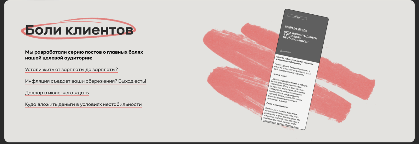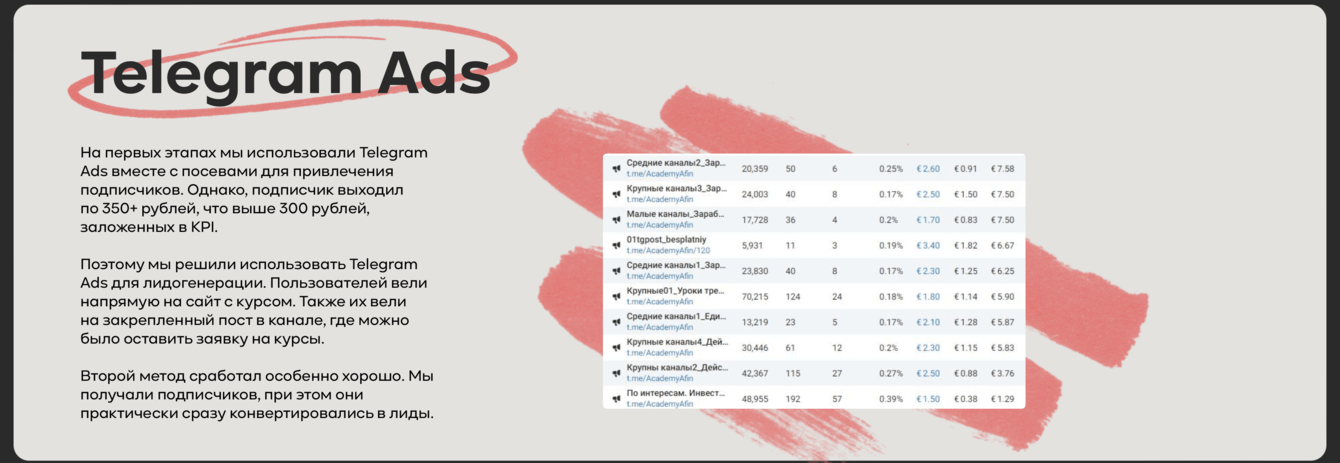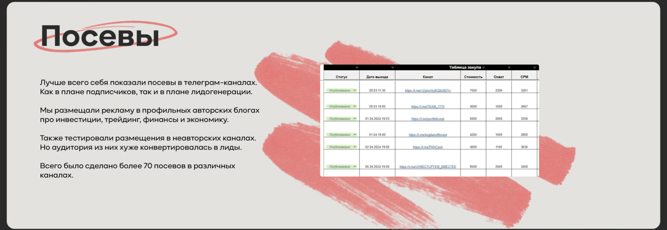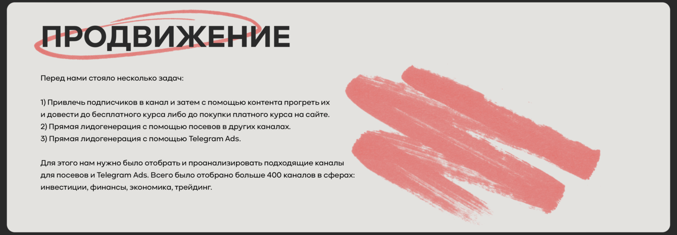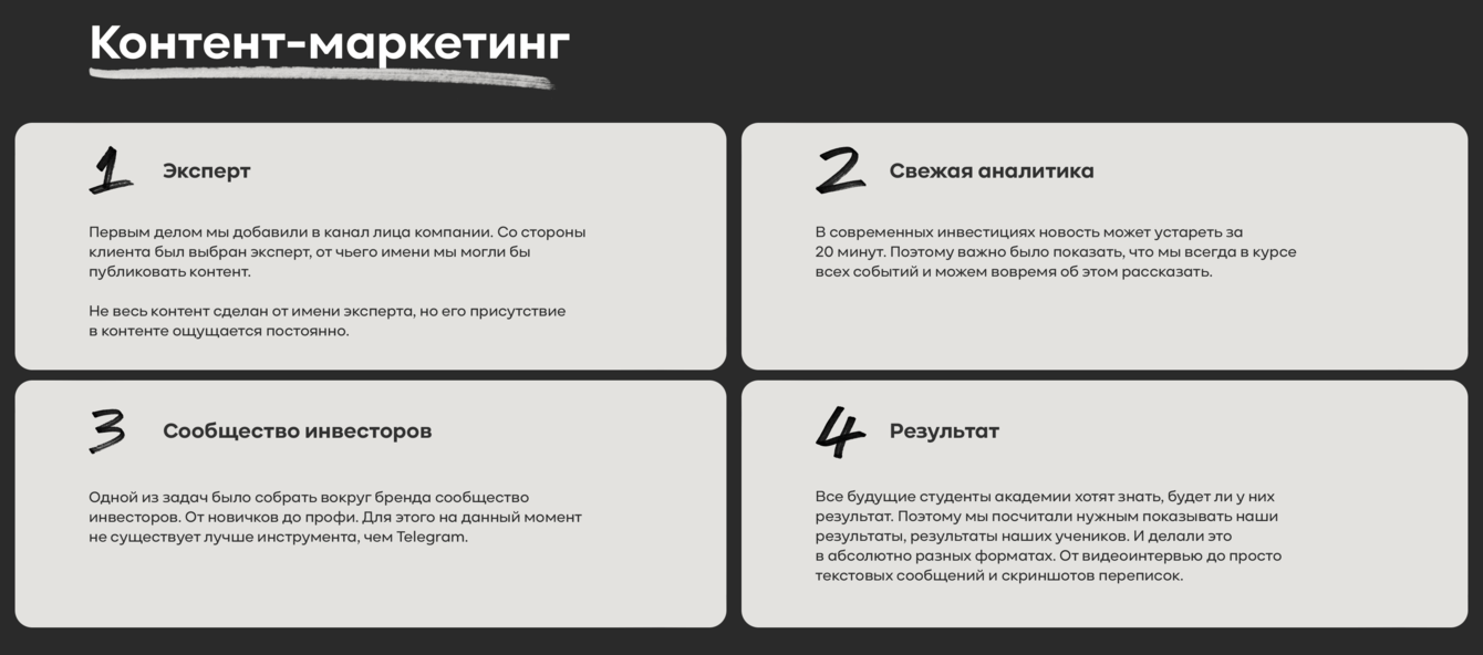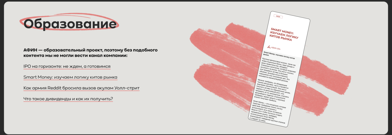 У компании глубоко проработанные курсы от практиков. Они нацелены на результат своих учеников, используют персональный подход к обучению от эксперта, всегда дают свежую аналитику и организуют закрытый клуб инвесторов. Мы захотели это всё транслировать через канал