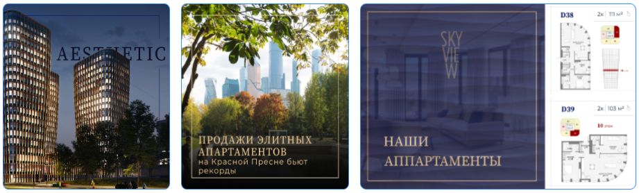 Главный посыл в рекламных кампаниях делаем на информационную пользу в сфере недвижимости и дизайна с основным призывом к действию — записаться на просмотр. Каждый рекламный пост размечали utm-метками. Лучше всего сработали следующие креативы: