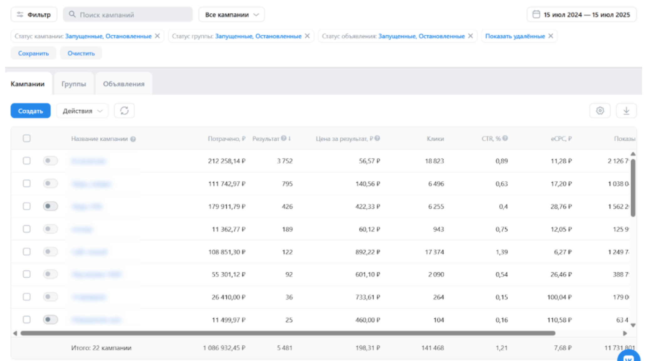 Скрин из рекламного кабинета за период 15.07.24-15.07.25
