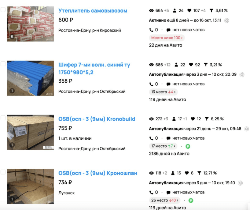 Первым шагом мы составили паспорт клиента: зафиксировали ассортимент, географию, цели по количеству заявок и бюджету. Дальше перешли к внедрению стратегии: Мы, по запросу клиента сделали акцент на утеплители и ОСБ-плиты как на ключевые продукты и создали серию уникализированных объявлений с продуманными заголовками и описаниями. добавили реальные фото и инфографику, чтобы объявления выглядели как полноценная витрина; начали системно публиковать объявления в разных регионах, расширяя охват; отслеживали статистику по каждому товару и корректировали слабые позиции. Важно: мы не ограничились одним или двумя объявлениями. В работу пошел весь ассортимент, что позволило «размножить» точки входа для клиента. Потенциальный покупатель видел разные товары и попадал в компанию через то предложение, которое ему было актуально в моменте.