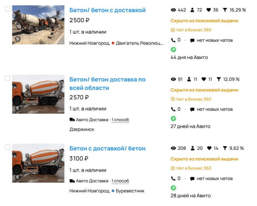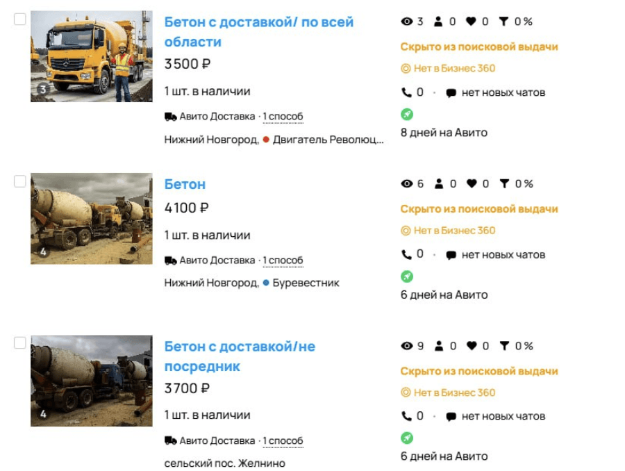 Клиент пришел к нам без работающих объявлений — на Авито «Бетон Нижний Новгород» у него стояли старые позиции, которым уже больше двух лет. Контактов почти не было, просмотры — до сотни в день, заявок — единицы. Мы начали с нуля: полностью переработали объявления, собрали аналитику, проверили ниши, и уже через несколько дней пошли первые звонки.