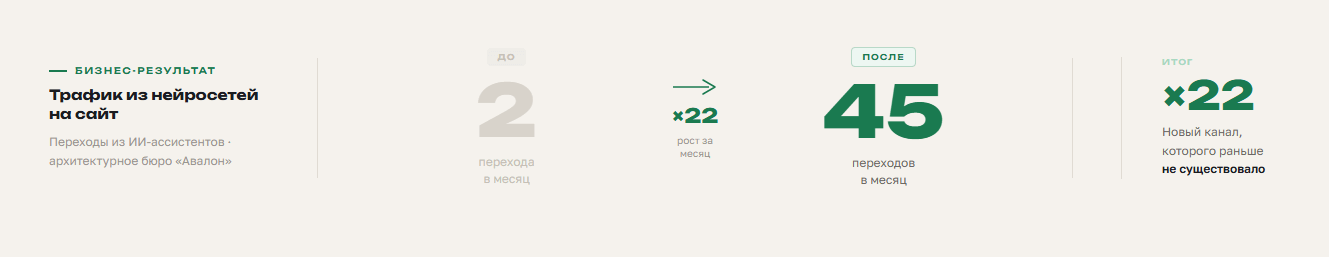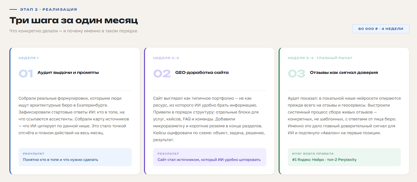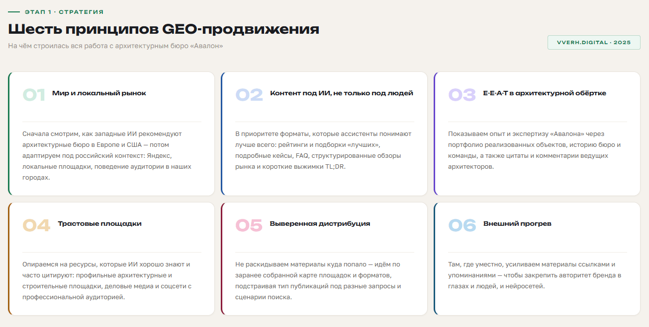 Мы пошли по тому же принципу, который используем в GEO-проектах для студий разработки, но адаптировали под архитектурное бюро: не контент-маркетинг как основа, а карточки и отзывы - потому что аудит показал, что именно на них опираются нейросети в локальной нише. Контент и внешние публикации - второй слой, усиливающий уже выстроенный фундамент.