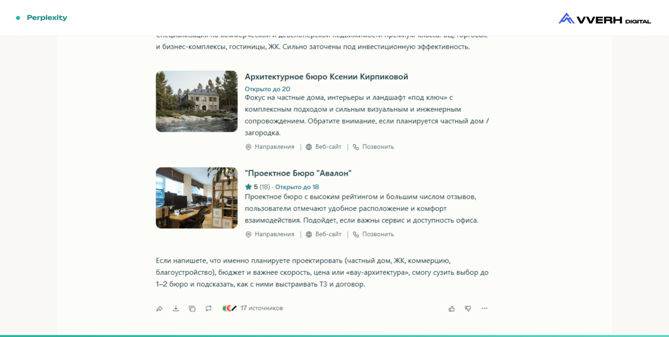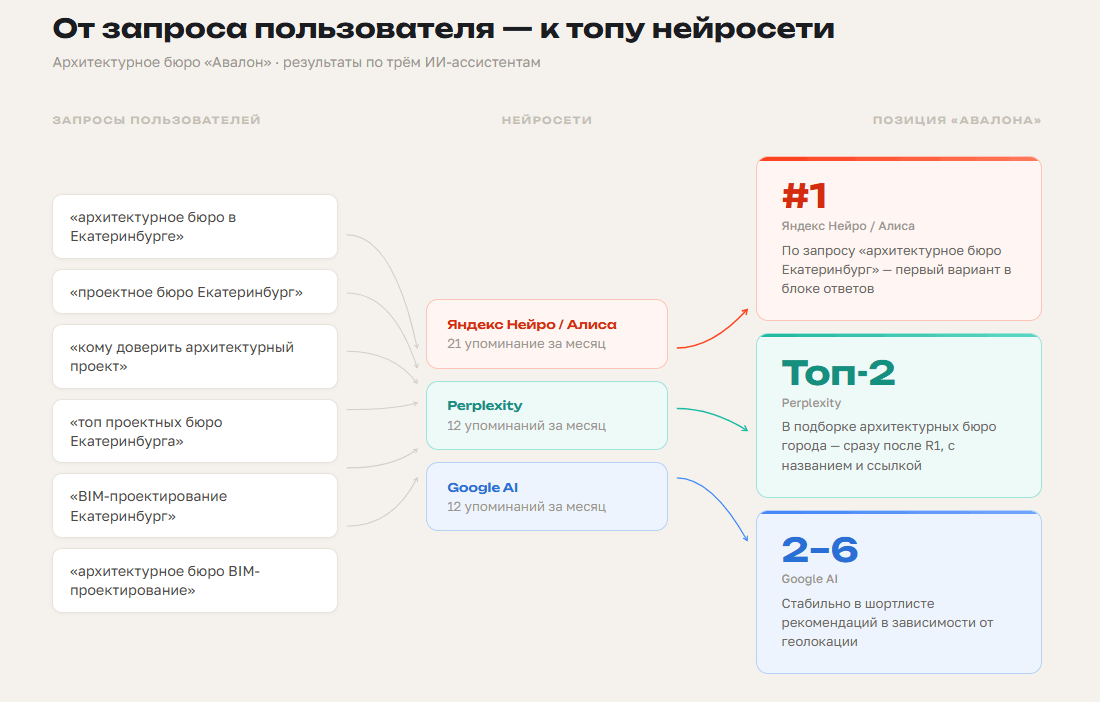 - Мир и локальный рынок. Сначала смотрим, как западные ИИ рекомендуют архитектурные бюро в Европе и США, а потом адаптируем эти выводы под российский контекст - Яндекс, локальные площадки и поведение аудитории в наших городах.