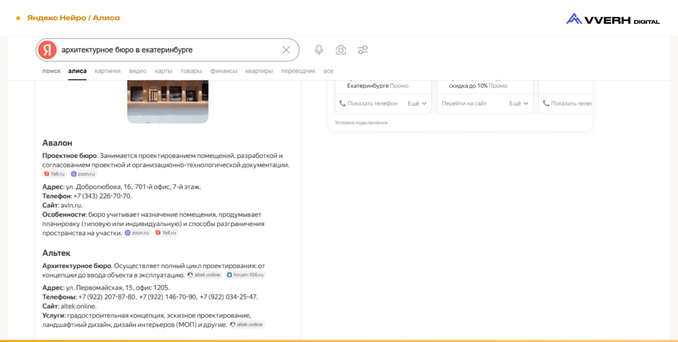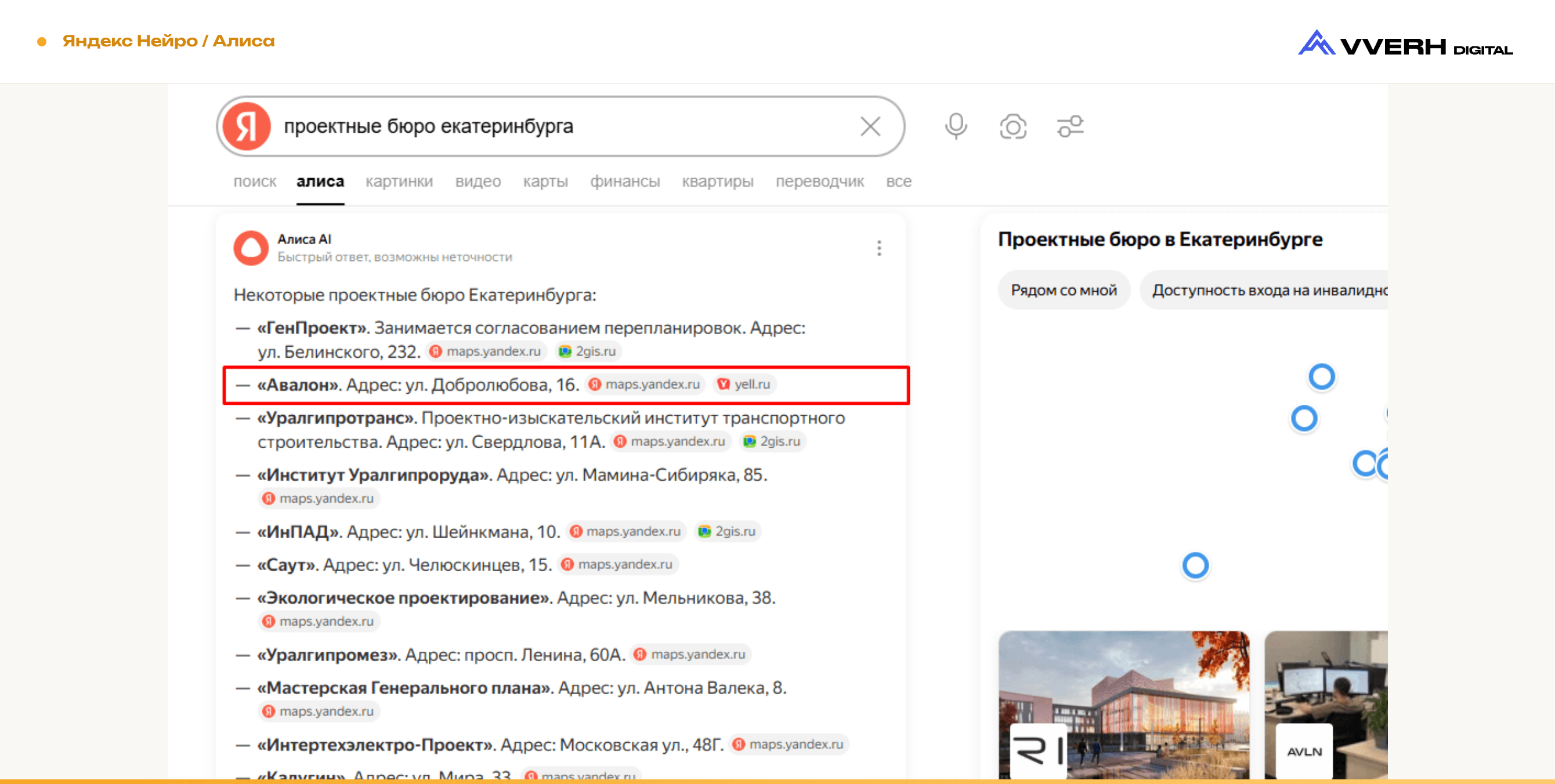 Ключевой для нас запрос - "Архитектурное бюро Екатеринбург". По данным замеров в октябре 2025 года архитектурное бюро "Авалон" стабильно занимает первую позицию в блоке ответов. Ассистент не просто упоминает бюро, а выводит его как основной вариант в подборке Архитектурное бюро в Екатеринбурге.