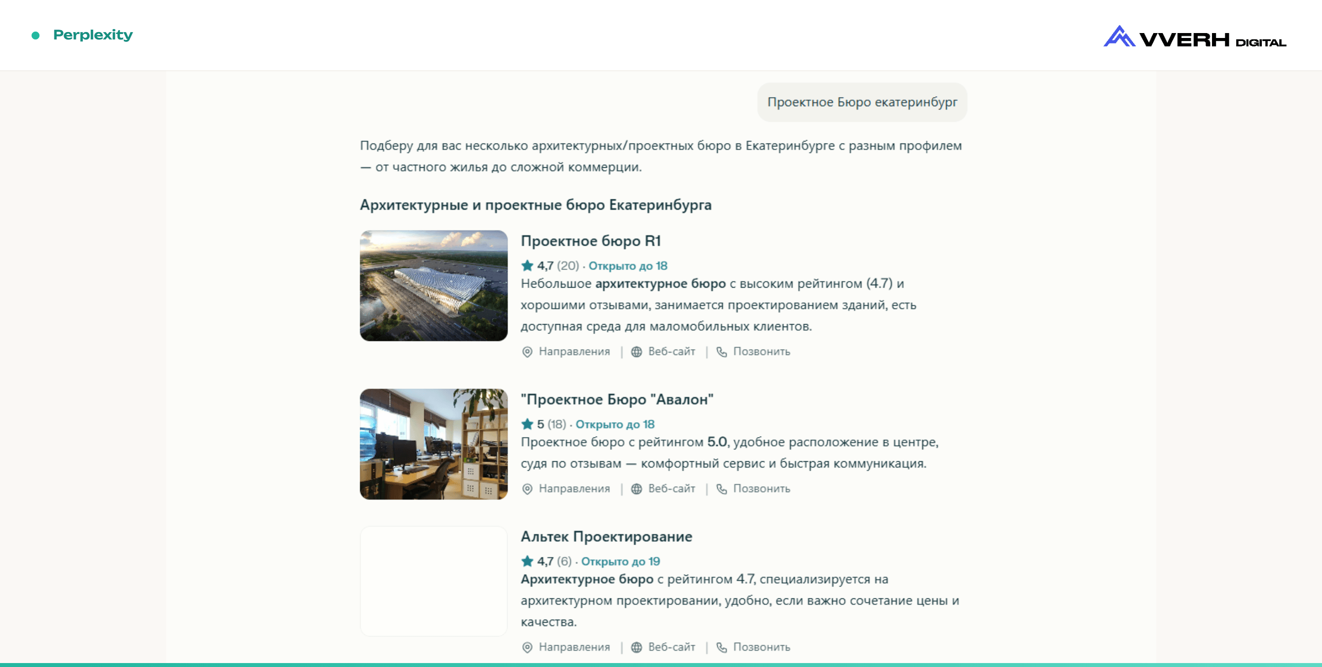 Сервис собирает подборку архитектурных и проектных бюро Екатеринбурга. В этой подборке "Проектное Бюро Авалон" отображается в верхней части списка - сразу вслед за R1. Perplexity подтягивает название бюро, краткое описание и ссылку на сайт. "Архитектурное Бюро" к сожалению было ниже, но не 0 как было на старте.
