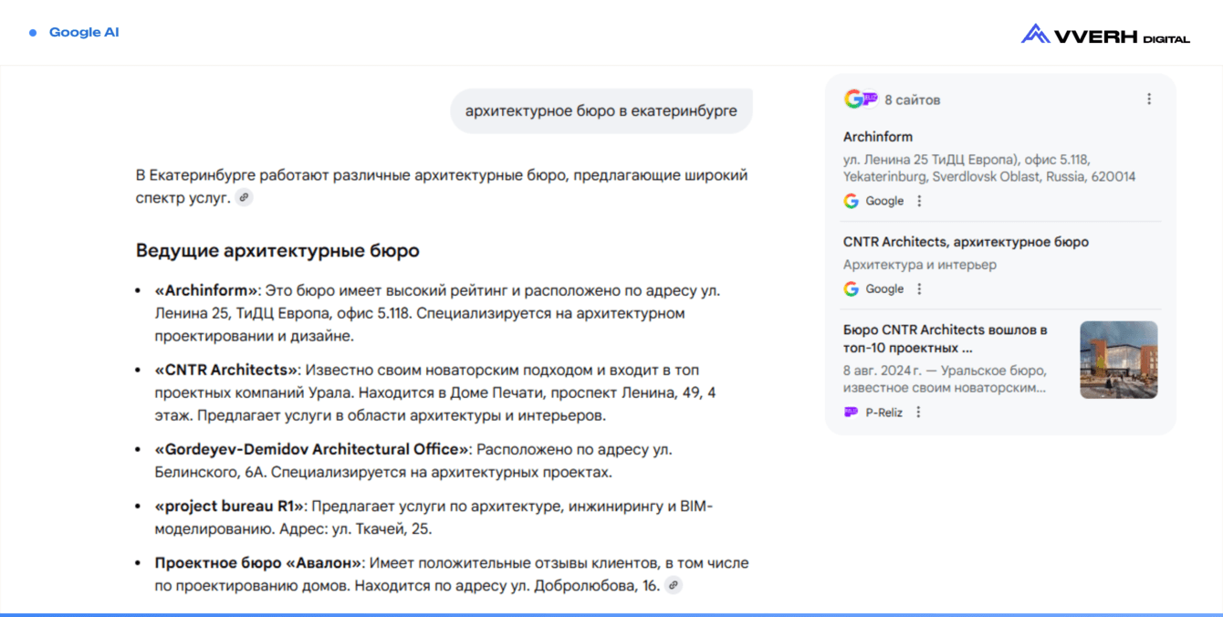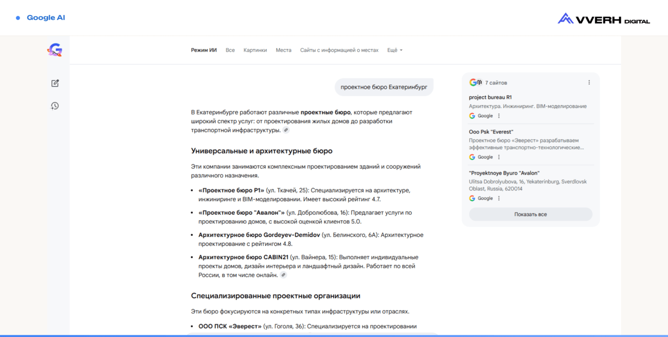 "Авалон" занимает позиции от 2 до 6 в ответах Google AI в зависимости от точной формулировки запроса и геопривязки пользователя. Бюро регулярно попадает в список вариантов, которые ассистент предлагает рассмотреть при выборе архитектурного или проектного партнёра в Екатеринбурге.