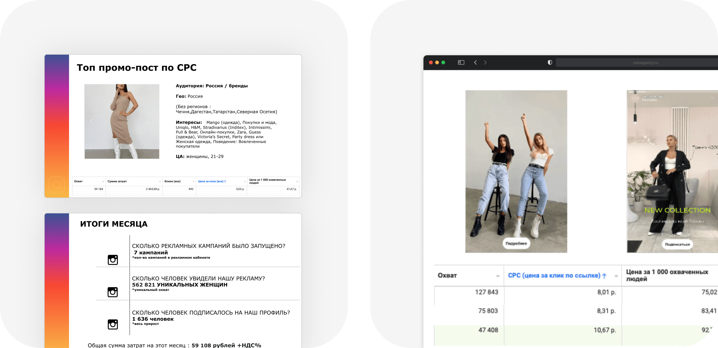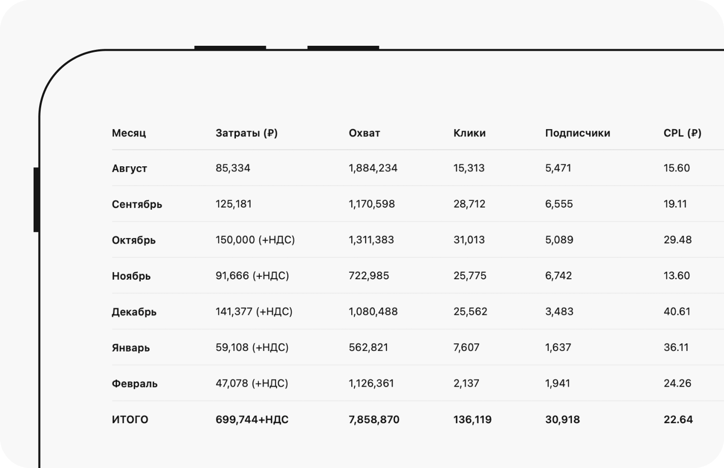 В конце каждого месяца формировали подробный отчет со всеми показателями, гипотезами и креативами, а также выводами и идеями для дальнейших тестов и масштабирования кампаний