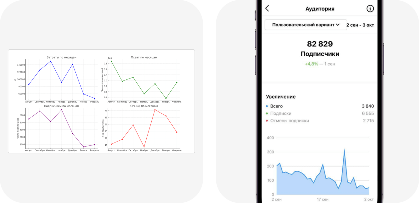 – Запустили кампании с разными связками, чтобы выявить, какие из них дают максимальную конверсию и самую низкую стоимость заказ и подписчика.