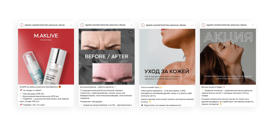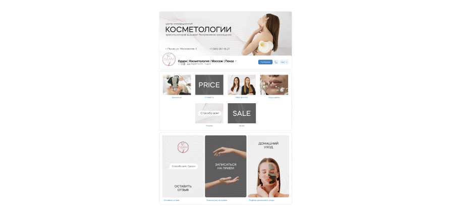 Какую информацию мы осветили? Рассказали о самой косметологии, услугах, актуальных акциях, о специалистах и их работах, показали отзывы.