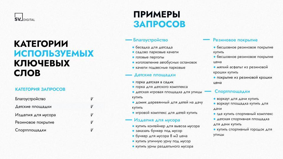 1. Структуре. Разделили кампании по категориям товаров («детские площадки», «спортплощадки» и прочие) для точечного управления бюджетом.