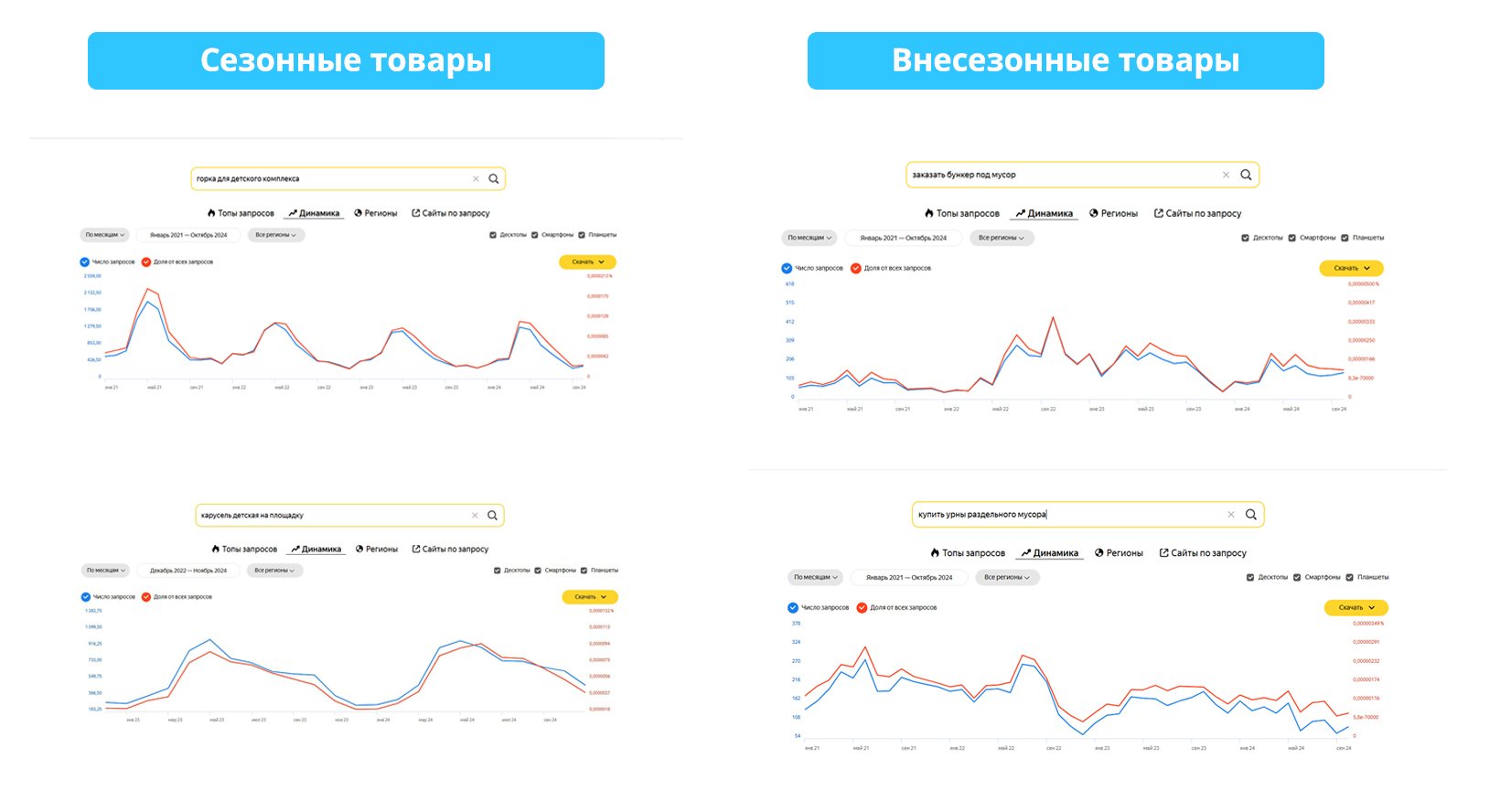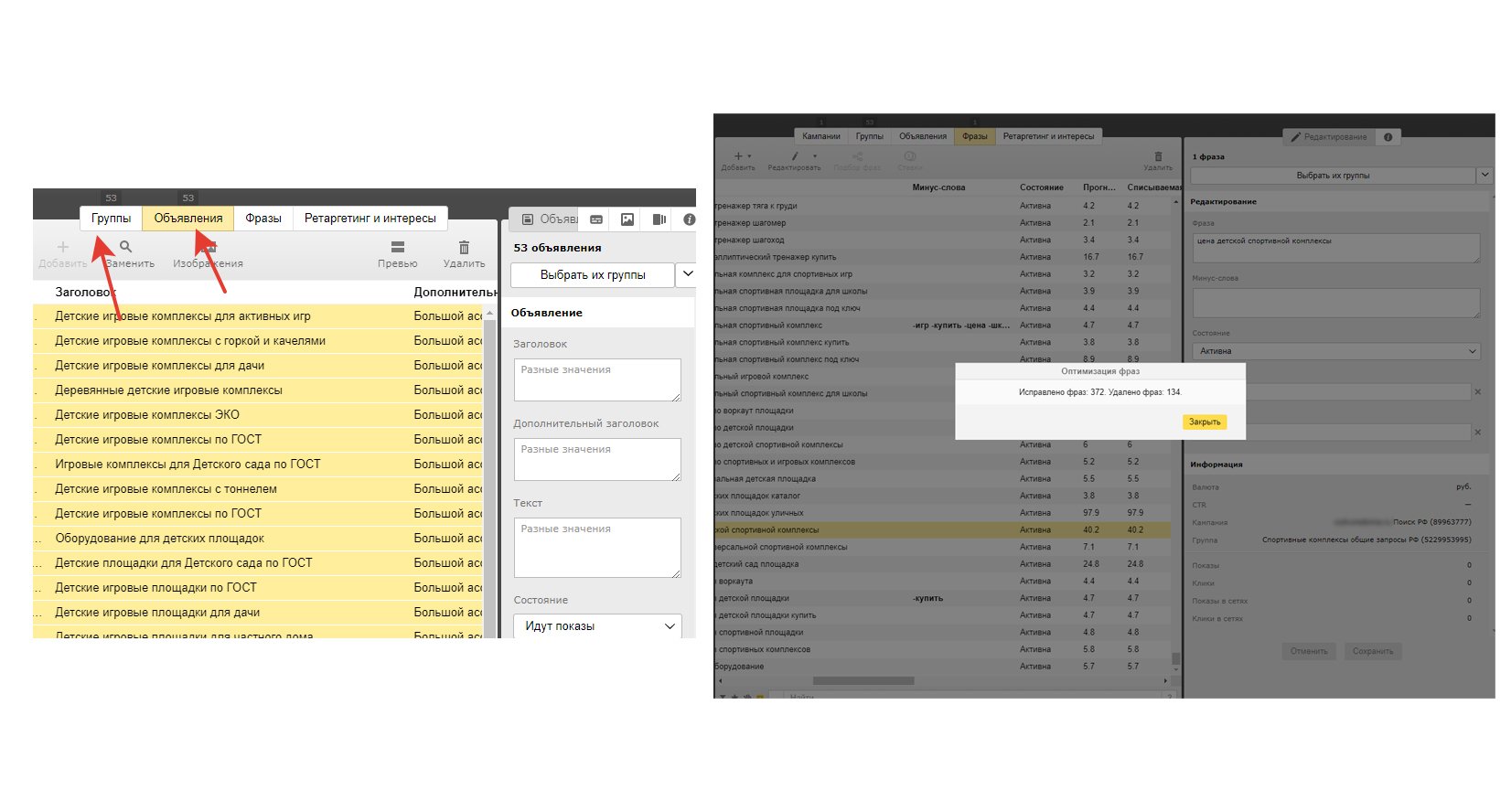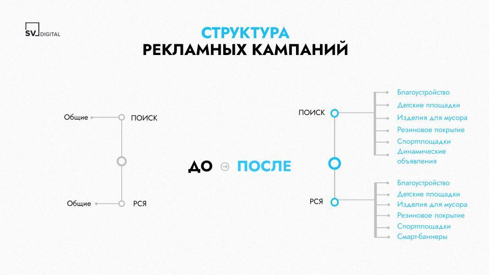 1. Структуре. Разделили кампании по категориям товаров («детские площадки», «спортплощадки» и прочие) для точечного управления бюджетом.