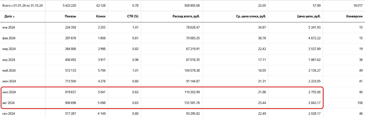 Переход на Единую перформанс-кампанию (ЕПК) в июле привел к ощутимому росту стоимости заявки — почти на 28%. Мы проконсультировались с поддержкой Директа и приняли решение поменять модель атрибуции, что позволило стабилизировать показатели.