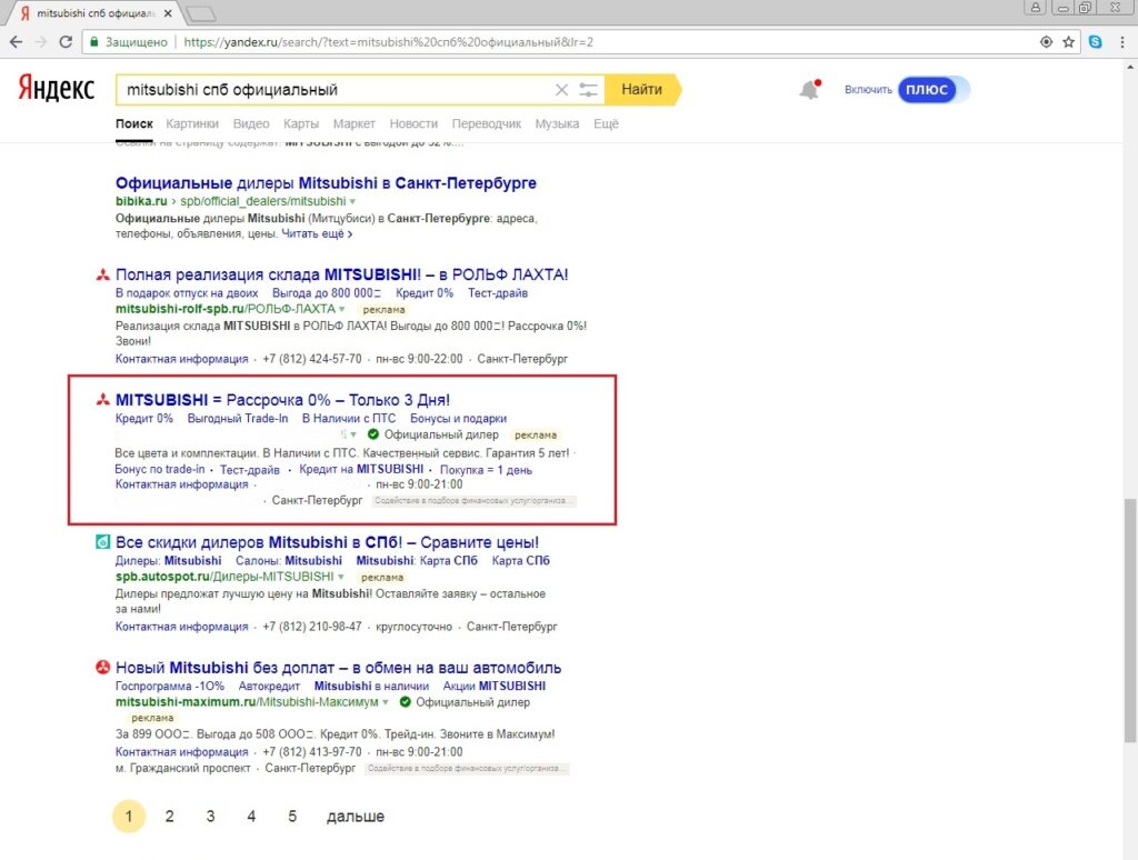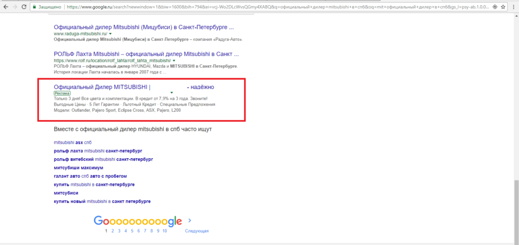 Прямые запросы — наиболее конкурентная и дорогая категория: «цена митсубиси», «автосалон мицубиси», «купить новый mitsubishi» и т. д.
