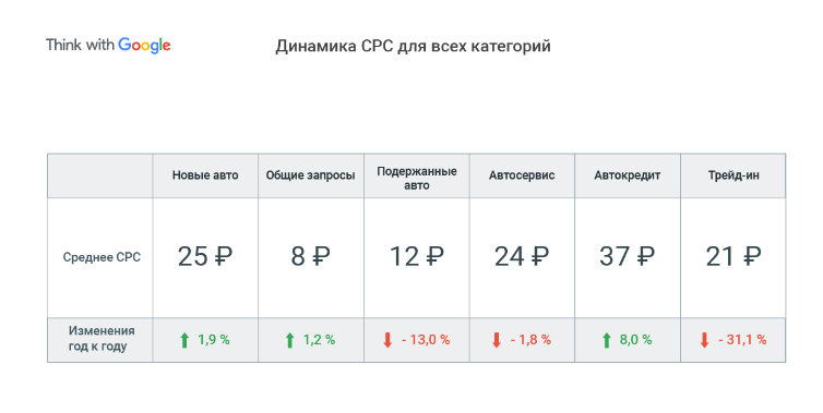 Снижение CTR (кликабельность рекламы) было во всех тематических категорий, кроме трейд-ин (+2%), что, в свою очередь, сказалось на стоимости клика. Так, CPC увеличилась в следующих категориях: «новые авто» до 25 рублей в среднем, «общие запросы» до 8 рублей, «автокредит» до 37 рублей. А в таких категориях цена клика снизилась: «подержанные авто» до 12 рублей (из-за общего снижения интереса к категории), «автосервис» до 24 рублей, а лидирующее место по снижению стоимости заняла категория «трейд-ин» до 21 рубля.