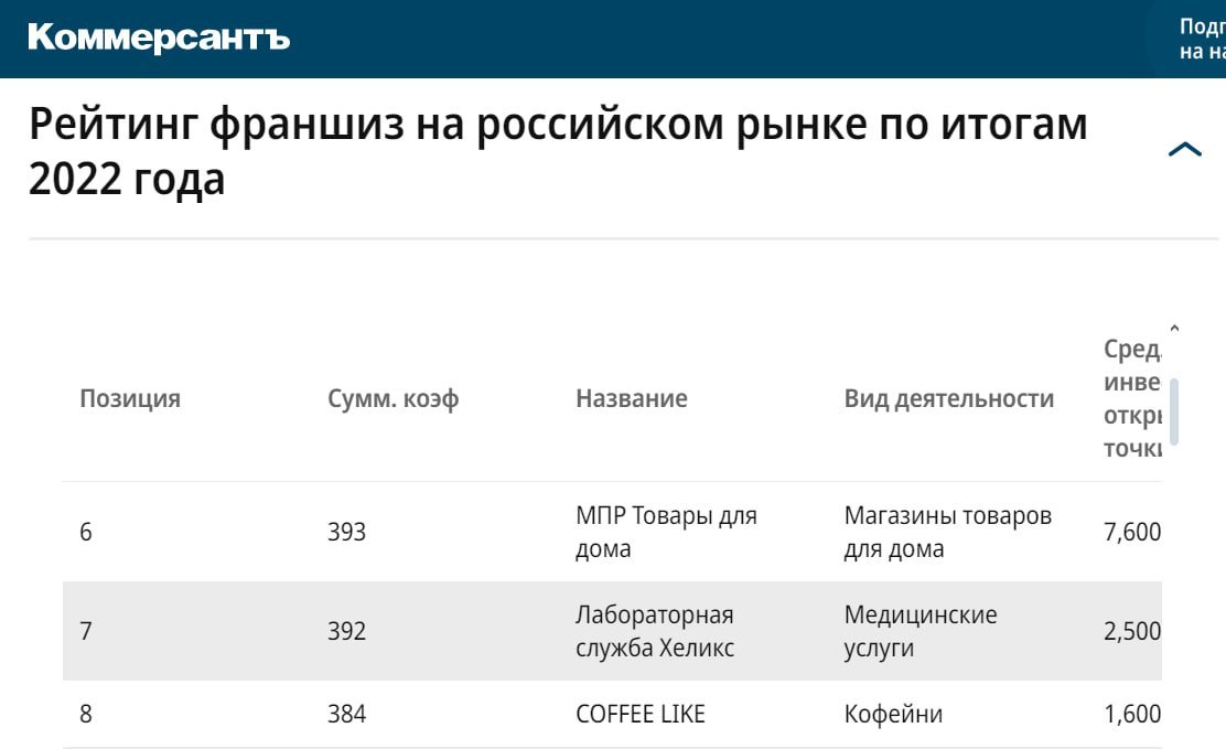 • Комсомольская правда. Рейтинг лучших франшиз кофеен в России