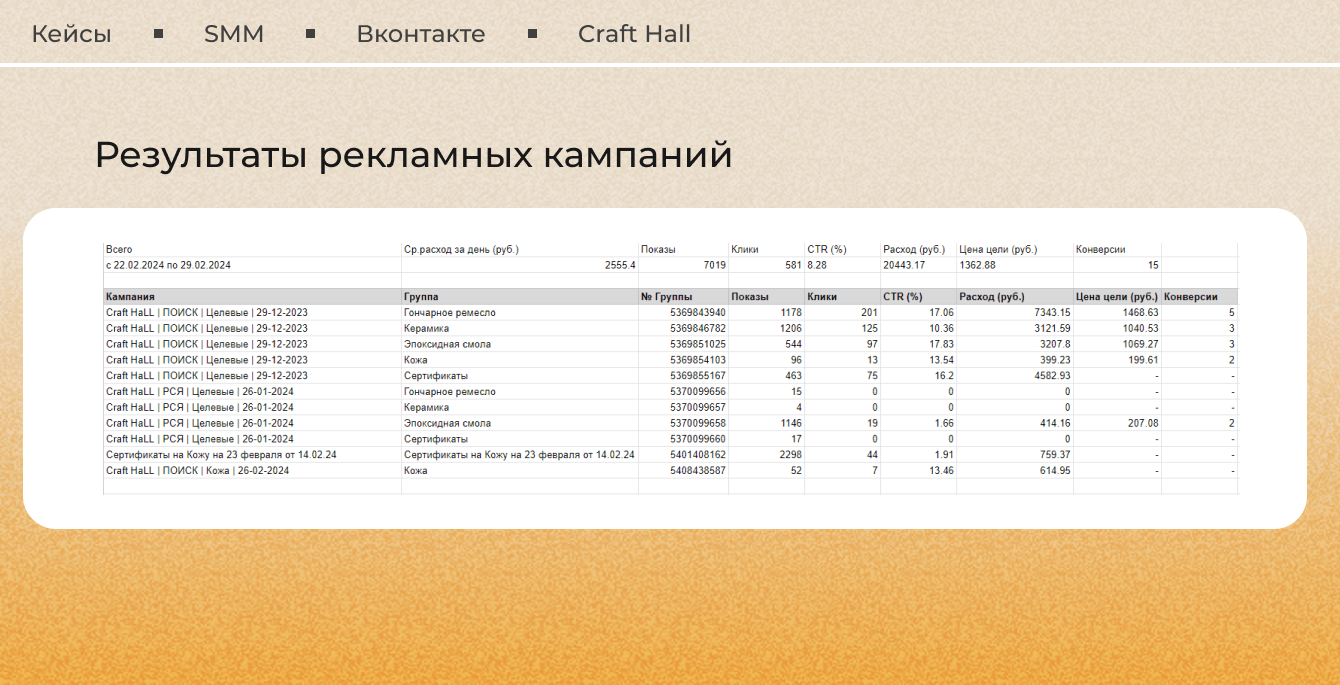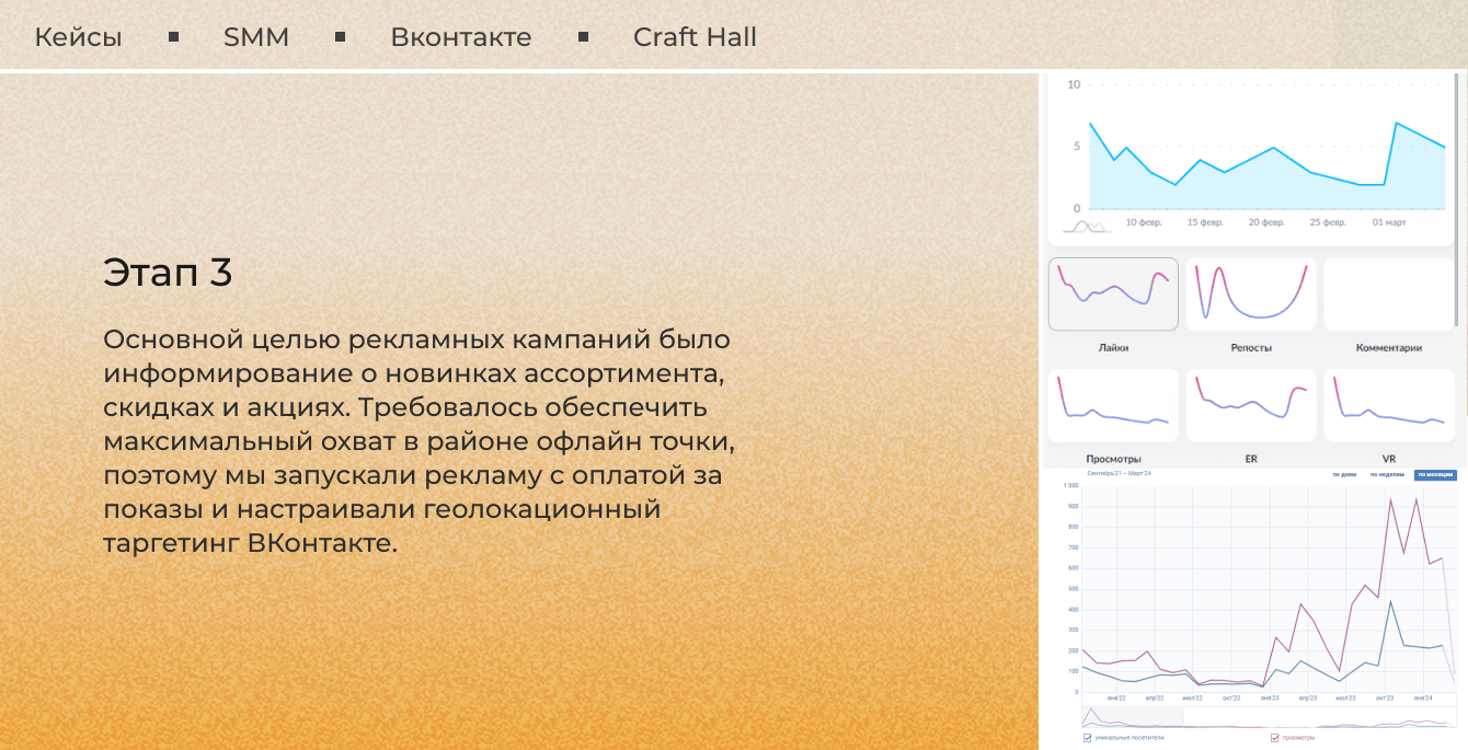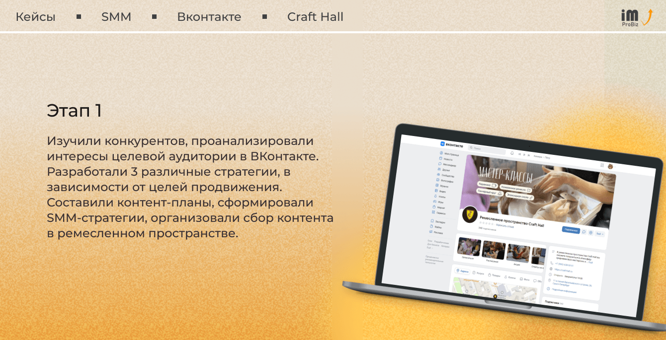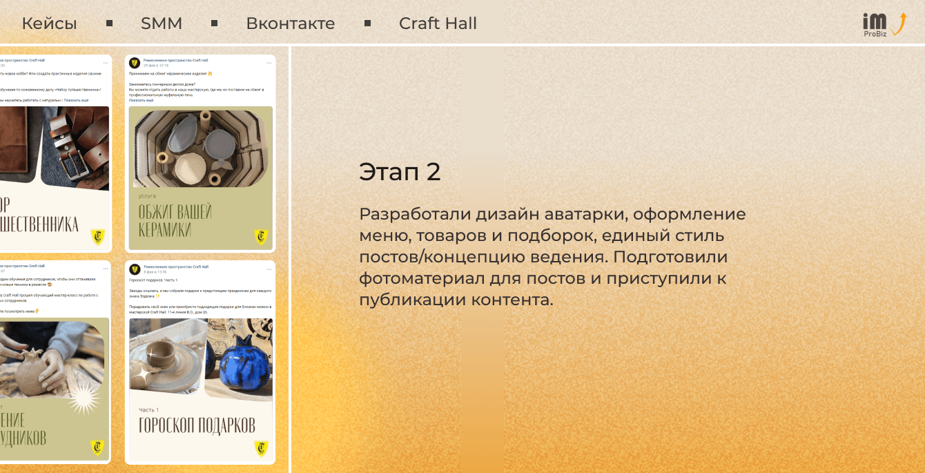 Изучили конкурентов, проанализировали интересы аудитории в ВК. Разработали 3 различные стратегии, в зависимости от целей продвижения. Составили контент-планы, сформировали SMM-стратегии, организовали сбор контента в ремесленном пространстве. Упаковали сообщество, начали запуск публикаций и запустили рекламную кампанию.