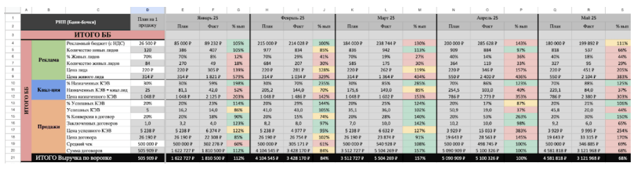 Мы разработали финансовую модель, где анализировался каждый шаг: количество лидов, стоимость одного обращения, конверсия в уточнение, конверсия в предоплату, финальная стоимость одного оплаченного заказа.