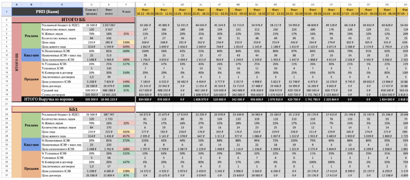 Чтобы реклама давала не просто поток обращений, а приводила к реальным заказам, мы настроили детальную аналитику на каждом этапе воронки. Еженедельно отслеживали качество входящих лидов, анализировали динамику, контролировали, как заявка движется до подготовки коммерческого предложения и внесения предоплаты, а также регулярно проверяли эффективность работы менеджеров.