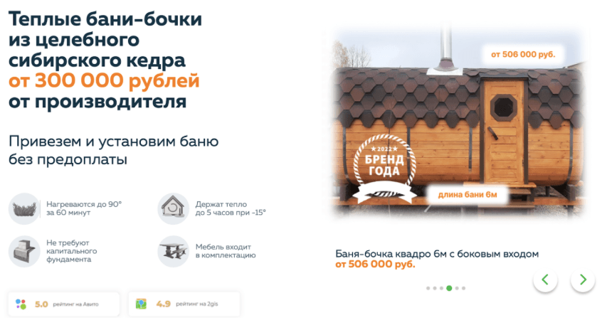 Это позволило сформировать уникальный стиль подачи, выделить клиента среди других производителей и привлечь качественный трафик — тех, кому действительно нужны бани-бочки.