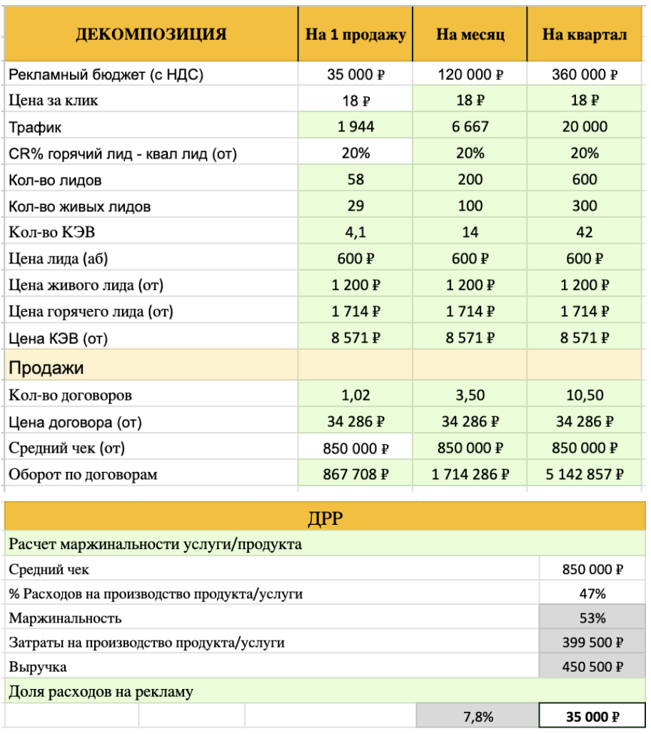 Декомпозиция воронки продаж до конкретной стоимости привлечения клиента