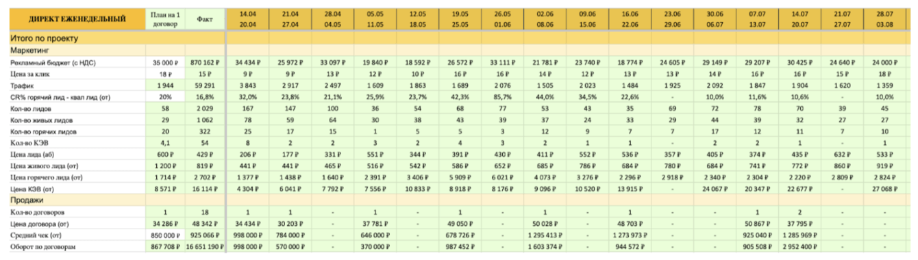 Мы выстроили проект по принципу РНП, что означает постоянный мониторинг ключевых показателей. Каждую неделю команда сверяла результаты по всем метрикам с плановой декомпозицией, анализировала эффективность рекламы, качество трафика и работу отдела продаж. Такой подход позволил быстро реагировать на изменения и повышать результативность кампании в реальном времени. Таблицу с еженедельными отчетами показывал выше.