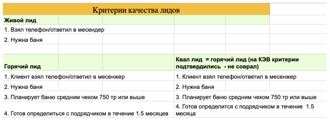 Такая таблица должна быть в каждом проекте, чтобы маркетинг и продажи не спорили друг с другом. Когда есть четкие критерии «живой» и квалифицированной заявки, все прозрачно понимают, с каким результатом они работают. Короче говоря, с такой таблицей РОП не ходит к маркетологу со словами: «У вас заявки некачественные», — а маркетолог не отвечает словами: «Это вы обрабатывать их не умеете!»