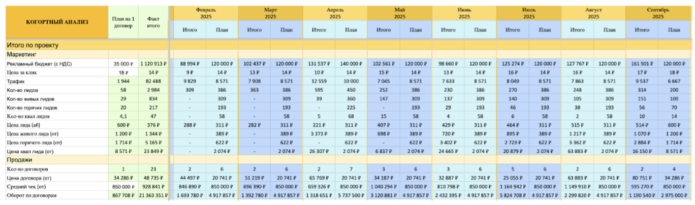 Основные метрики фиксировали в таблице когортного анализа, которая позволяет отслеживать, как клиенты проходят путь от первого обращения до заключения договора.