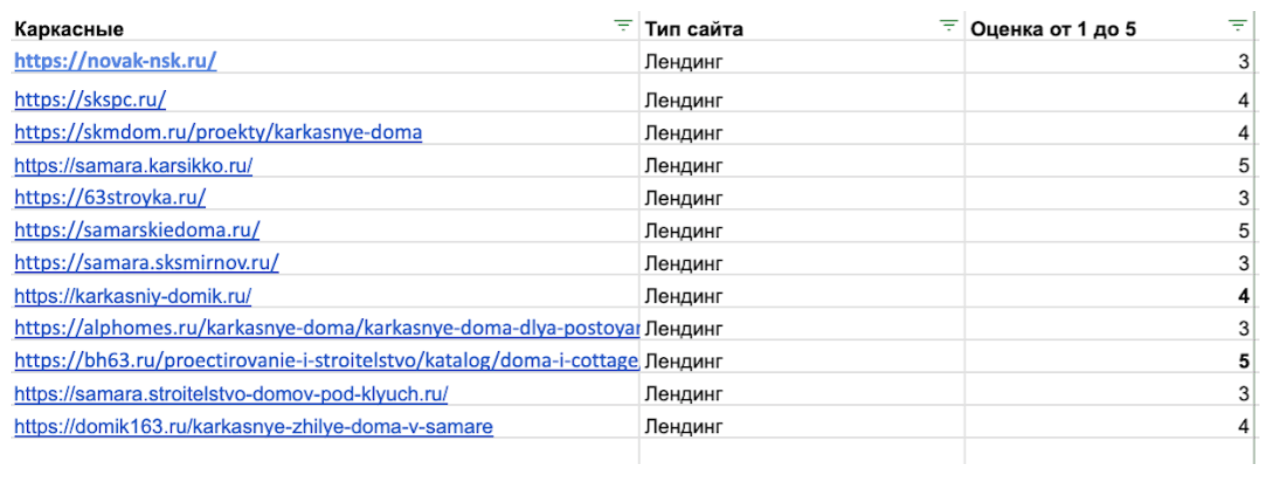 Затем оценили сайты конкурентов по ряду критериев: качество оффера, наличие калькулятора стоимости или квиза, фото и видео готовых объектов, реальные отзывы, демонстрация этапов строительства. Каждому ресурсу присваивался рейтинг от 1 до 5 баллов. Для ориентира в своей стратегии мы брали сайты с оценкой не ниже 4.