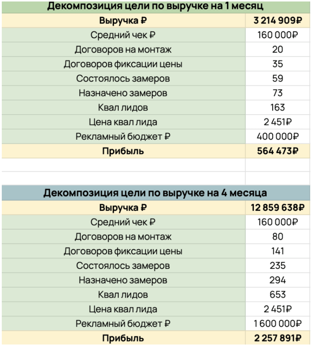 На 4 месяца: при бюджете 1,6 млн ₽ получить 80 монтажных договоров, договоров фиксации цены — 141, состоявшихся замеров — 235, квалифицированных лидов — 653. Планируемая выручка — 12 859 638 ₽, прибыль — 2 257 891 ₽.