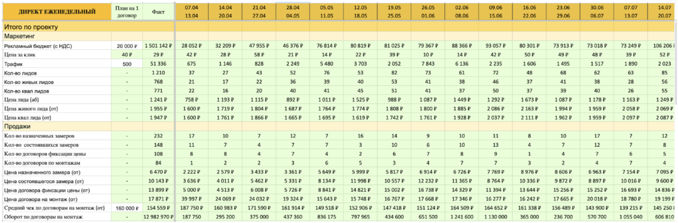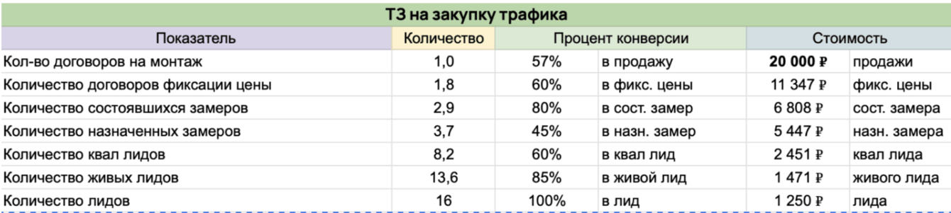 Для этого мы разработали детализированное ТЗ на закупку трафика, где каждый этап воронки оценивается через ключевые показатели: количество лидов, конверсию и стоимость на каждом шаге.Путь лида и финансовая модель на 1 договор выглядели следующим образом (1й скрин)