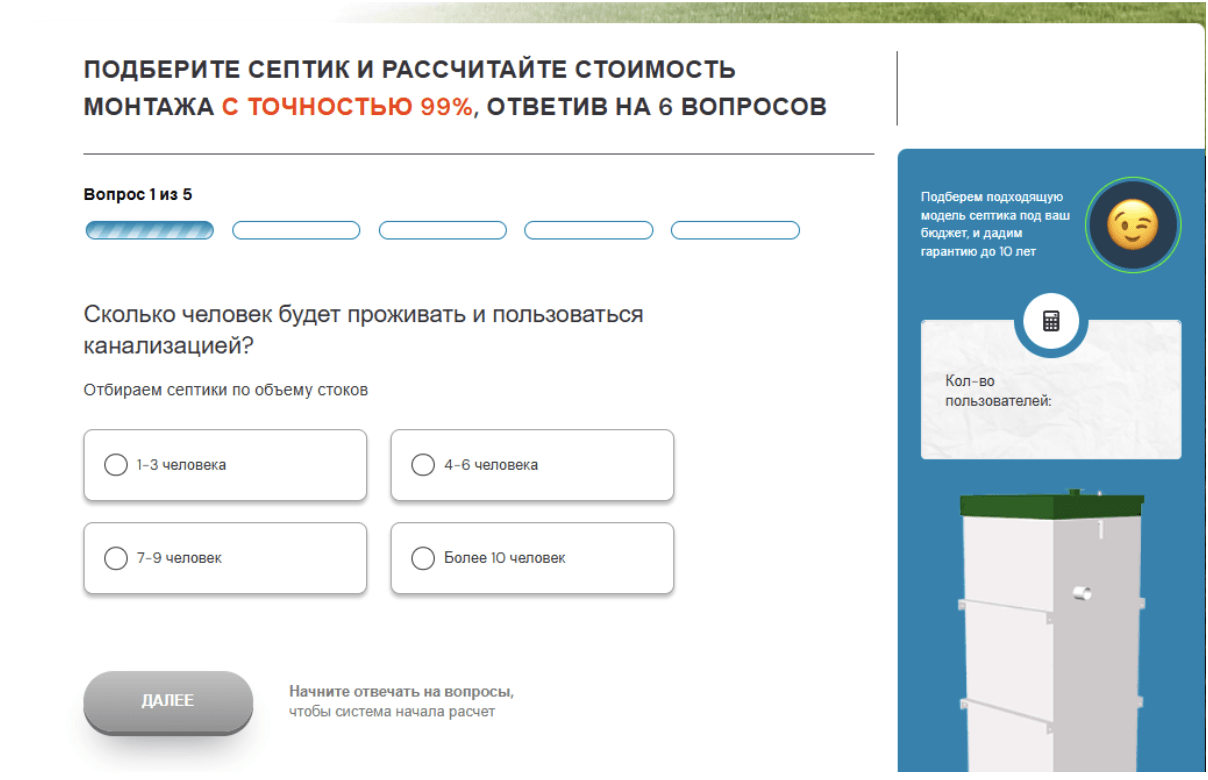Перед запуском мы провели продвинутый детальный конкурентный анализ. Сначала были собраны все компании, с которыми мы будем конкурировать напрямую, по таким запросам как: «заказать септик в Москве», «Септик под ключ», «Септик цена» и т.д. Оценили сайты по нескольким параметрам: качество оффера, наличие квиза, социальные доказательства, фотографии монтажников и процесса установки, отзывы и видеообзоры.