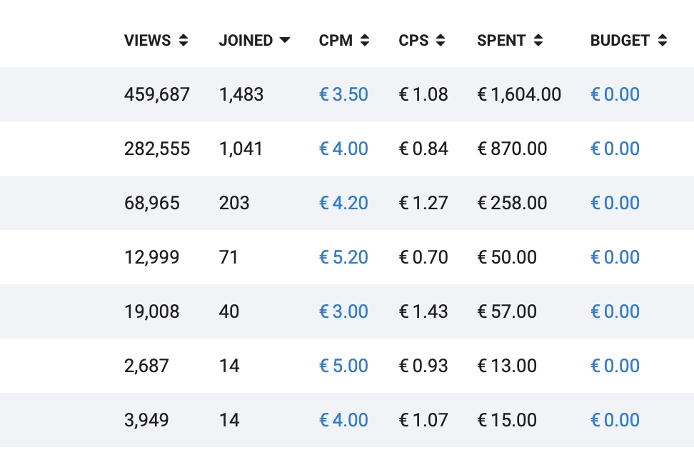 Самая эффективная кампания привлекла 1 483 подписчика по цене 1,08 евро при CPM 3,50 евро.