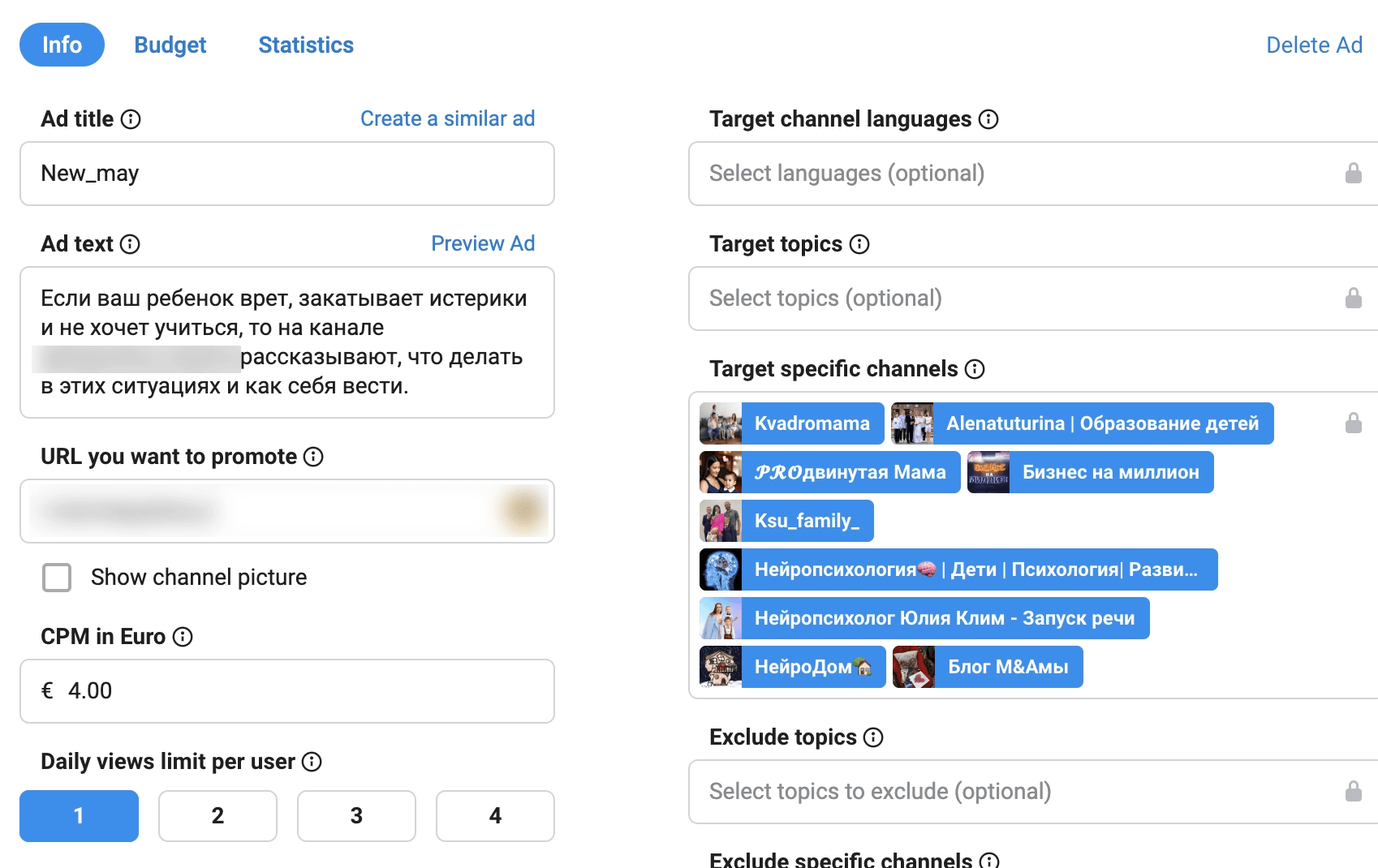 Были запущены рекламные кампании в Telegram Ads с таргетингом на подписчиков тематических Telegram-каналов, связанных с детской психологией, нейропсихологией и воспитанием. Основной упор — на рекламу в нативном формате внутри каналов.