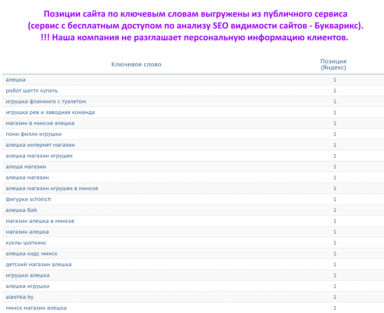 Интернет-магазин “Алешка” стал более узнаваемым брендом. Сайт стал более узнаваемым и популярным среди родителей, что привело к росту доверия к бренду и к увеличению продаж. Если вам требуется продвижение интернет-магазин детских игрушек, то обращайтесь в наше агентство по SEO-раскрутке сайтов.