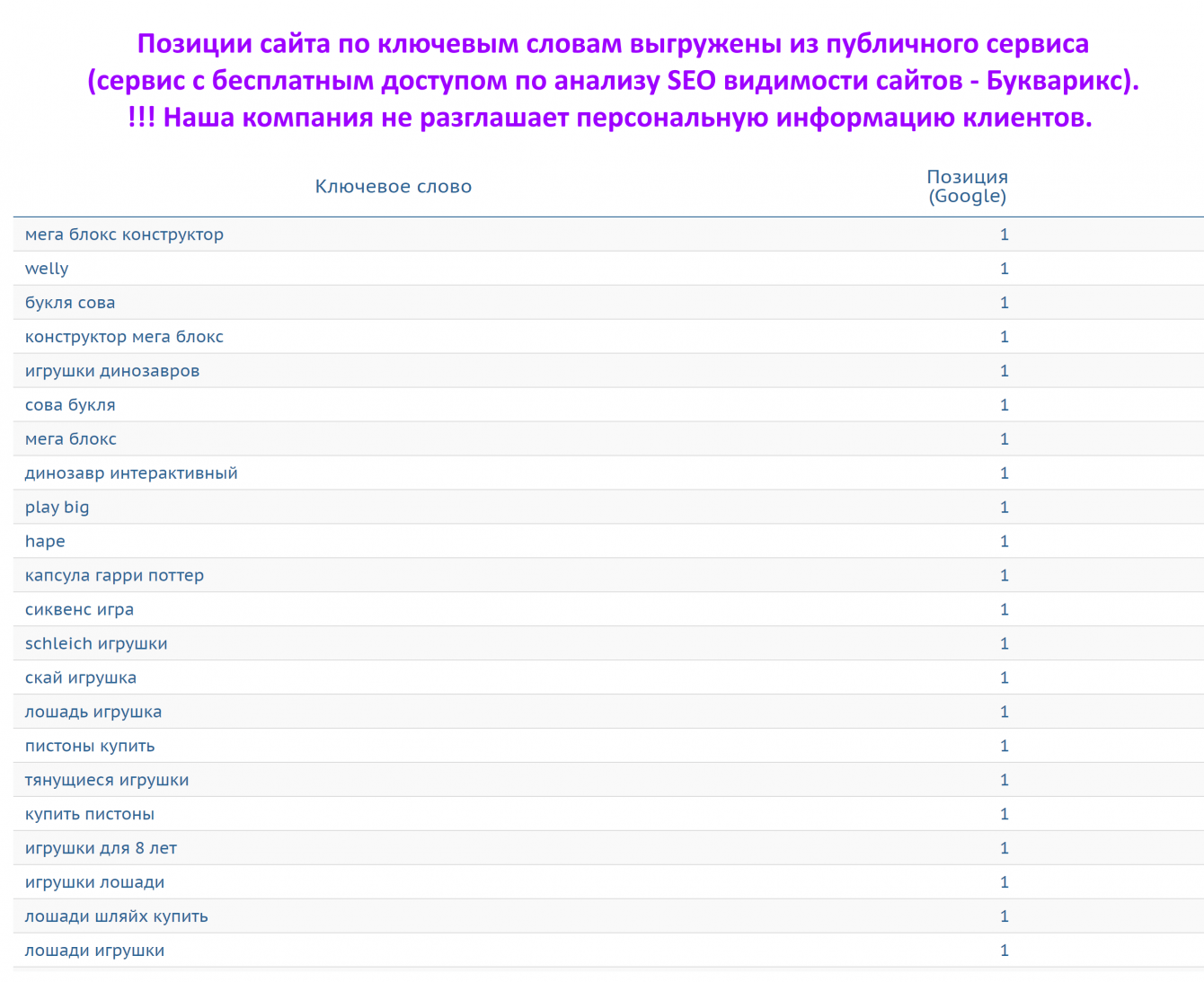 При раскрутке интернет-магазина детских игрушек проводился регулярный мониторинг ключевых показателей эффективности, таких как: трафик сайта, позиция в поисковой выдаче, количество заказов, средний чек, конверсия и т.д.