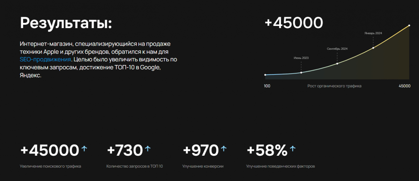 Интернет-магазин, специализирующийся на продаже техники Apple и других брендов, обратился к нам для SEO-продвижения. Целью было увеличить видимость по ключевым запросам, достижение ТОП-10 в Google, Яндекс.