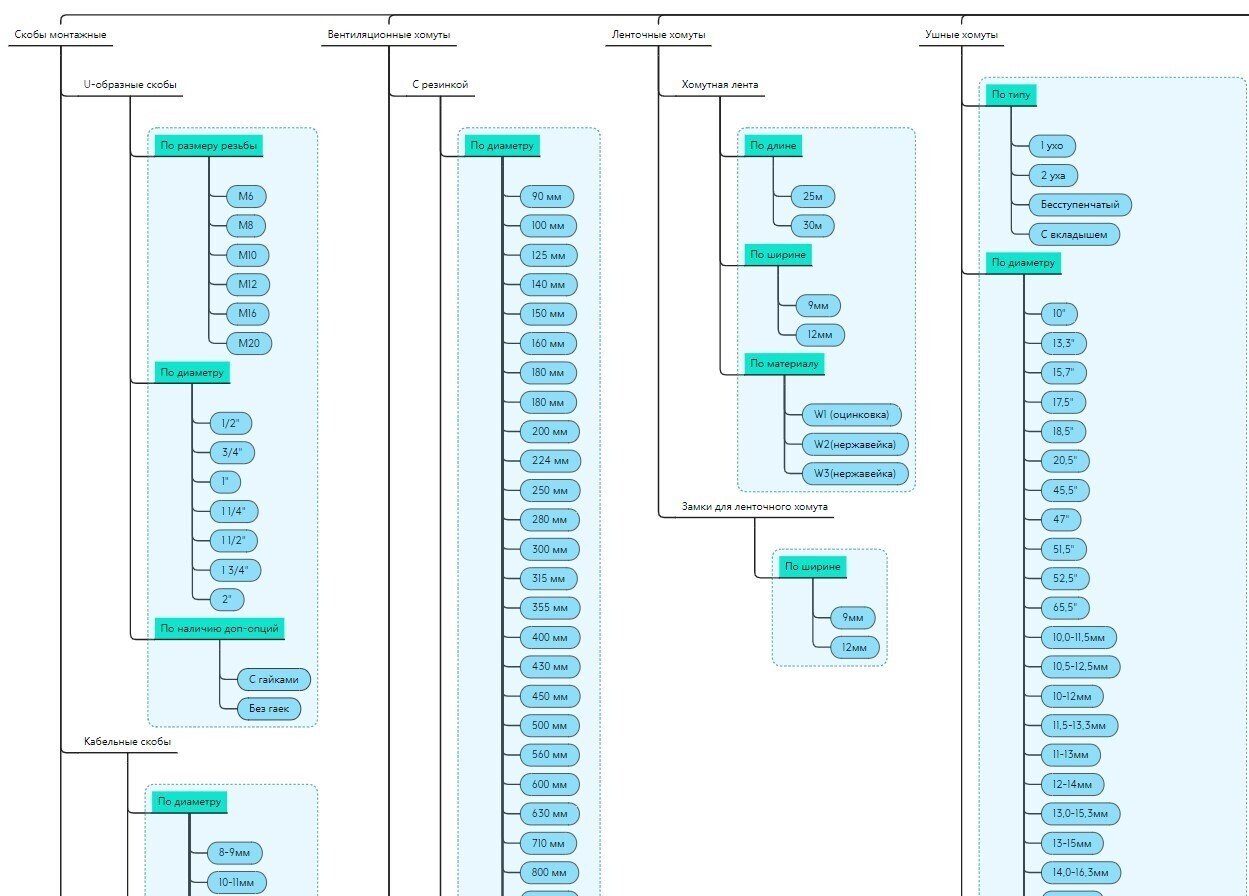 Каждый тип товара был помещен в отдельный раздел, который в свою очередь также подразделялся по характеристикам на более низких уровнях вложенности.