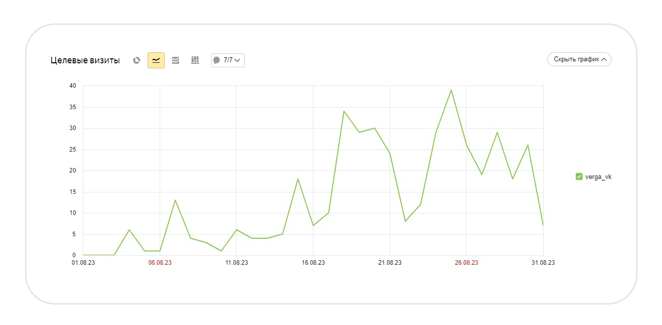 Чтобы не терять время и точнее понимать, как работает запущенная нами реклама, взяли показатели по заявкам из Яндекс Метрики. Затем рассчитали процент заявок с рекламы от общего количества заявок: ВК сообщество + сайт, так же рассчитали процент от продаж.