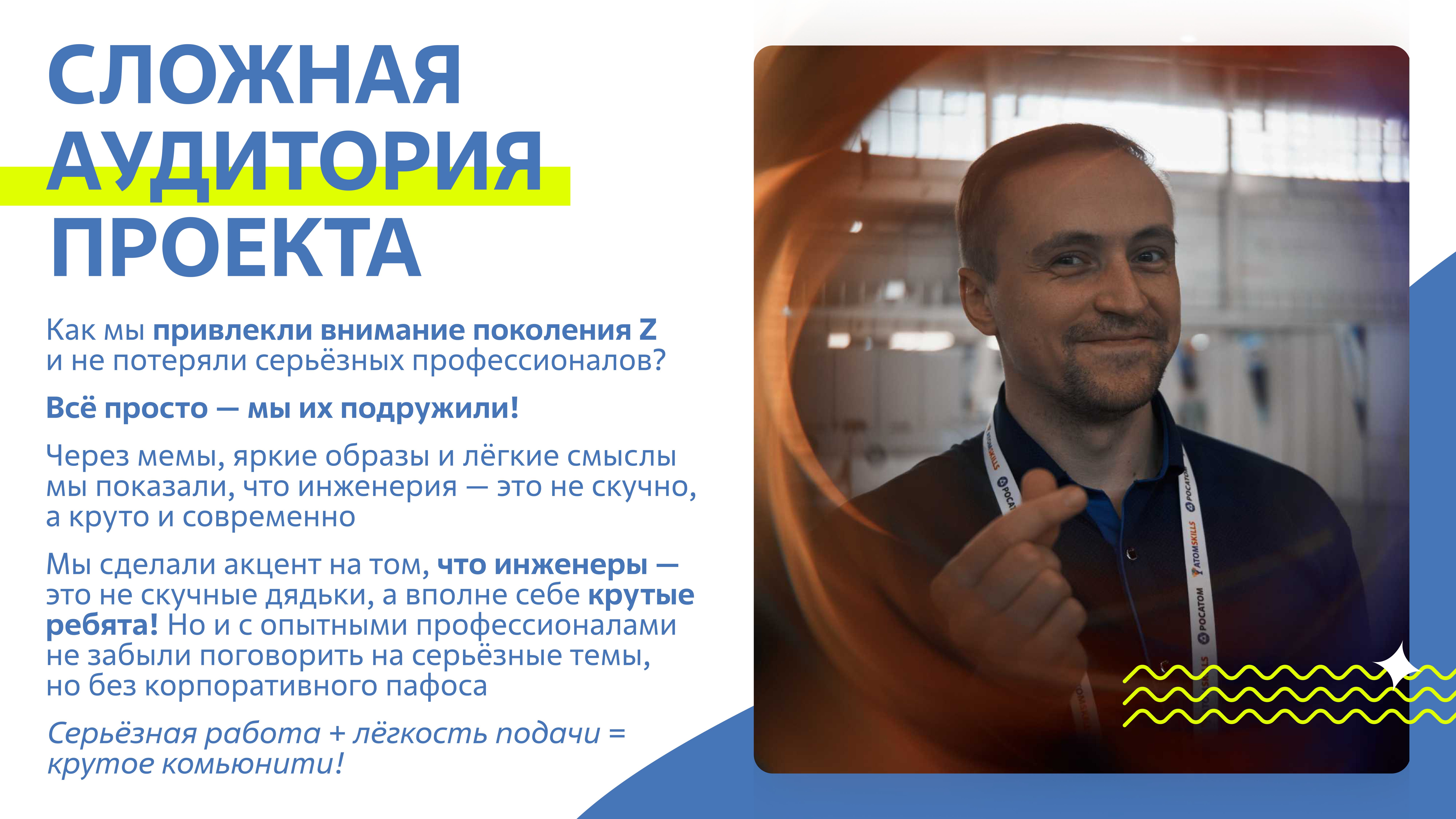 Заказчик: Росатом — это не только мировой лидер в атомной энергетике, но и основа для формирования будущего кадрового потенциала страны. У компании есть целое направление по обучению и развитию инженерных компетенций, которое будет формировать будущие кадры для отрасли.