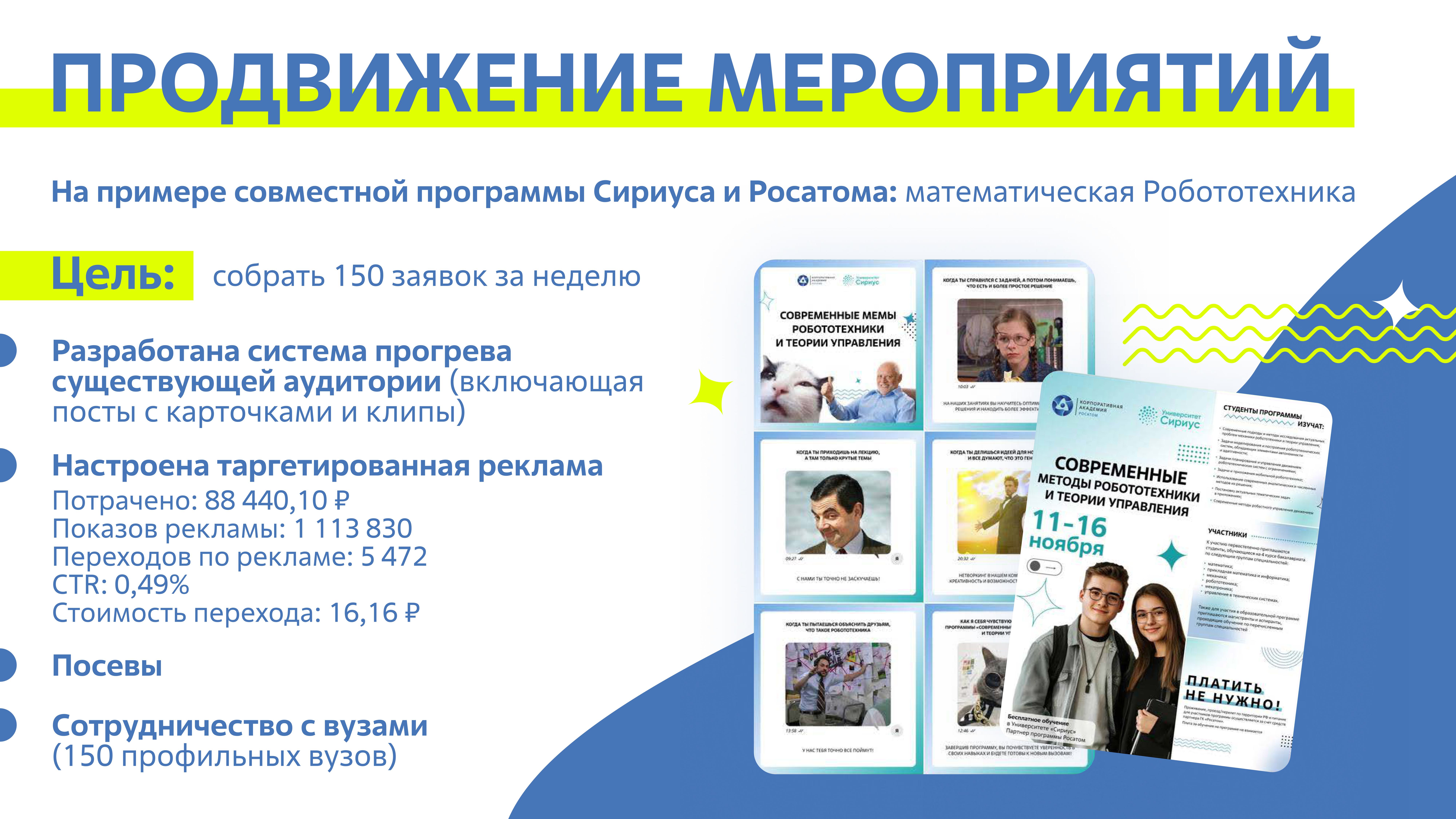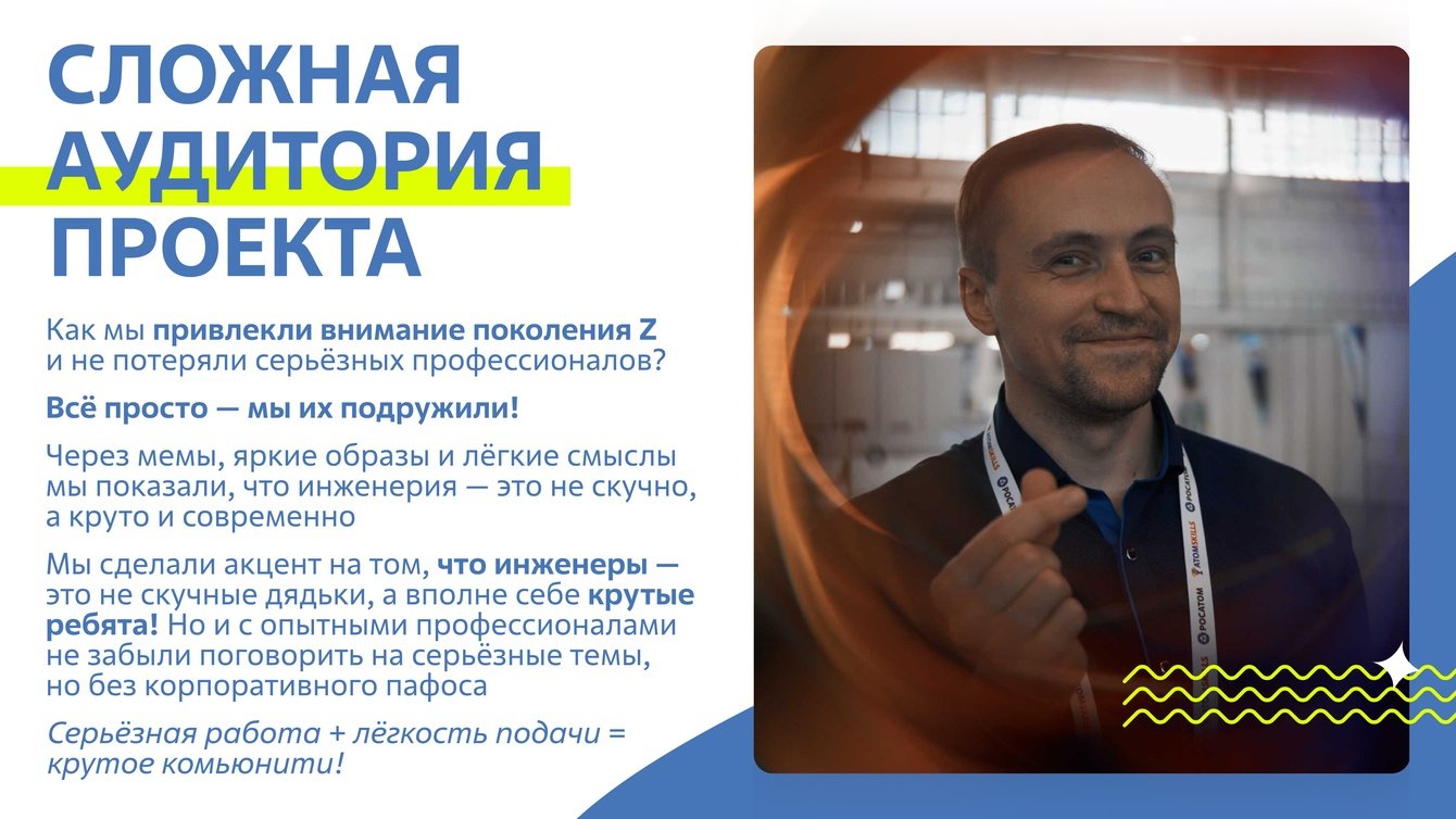 6) Привлечение молодежной аудитории (Юниоры Росатома): Успешное вовлечение молодежи в образовательные и карьерные инициативы через кампании в социальных сетях и мероприятия.