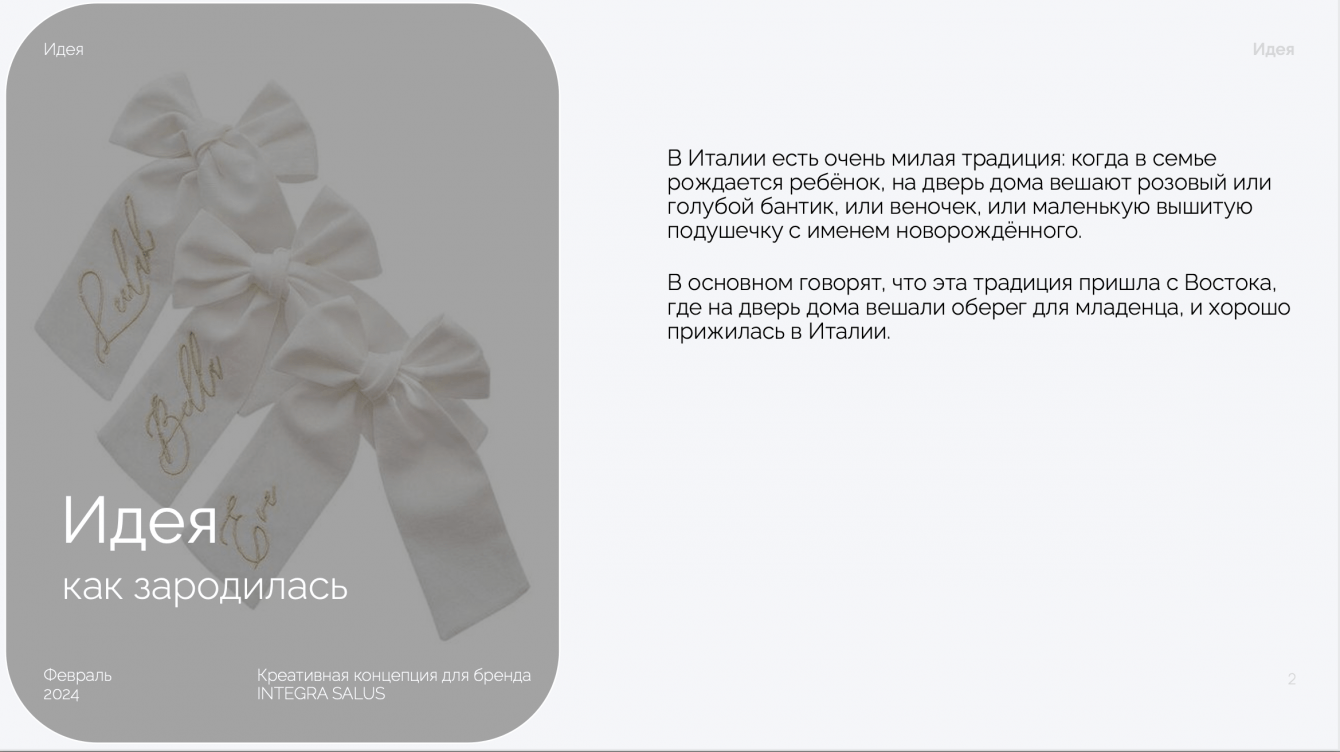 Мы подготовили подарки для лидеров мнений, включающие в себя продукцию бренда, создали фирменную открытку, каждую из которых подписали от руки персональным посланием, и произвели белые льняные банты, которые приурочены к итальянской традиции.