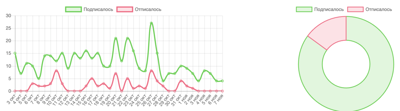 Ниже визуальное отображение того, как выглядел график подписок на бота. В дни массовых рассылок наблюдался небольшой отток аудитории, но на общем объеме это было всего около 13% пользователей.