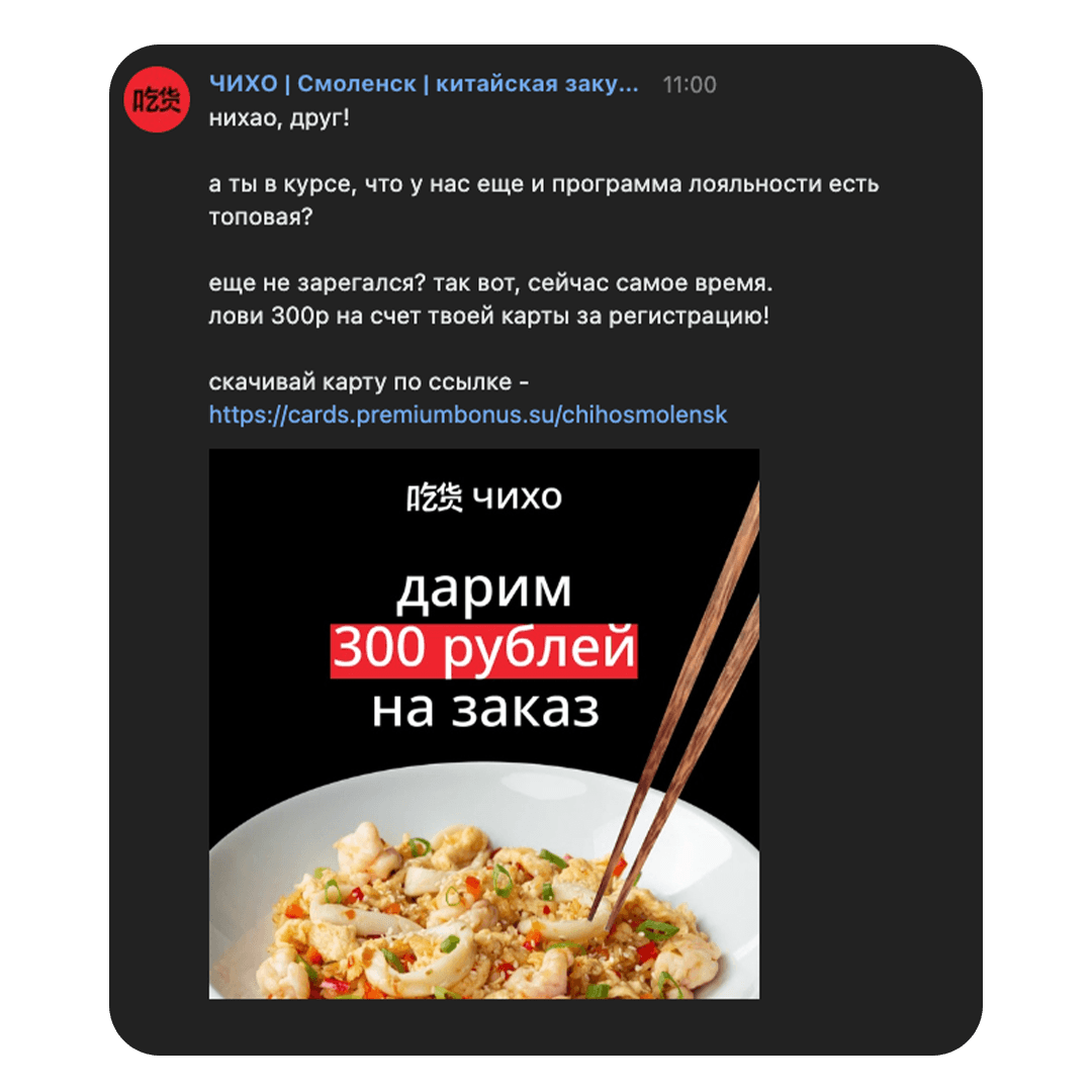 2 раза в неделю пользователям отправлялись стимулирующие рассылки в боте (рис.2 и рис.3). ЧИХО порадовали своим изобилием всевозможных промоакций, поэтому пользователям было полезно находится в боте, т.к мы радовали их промокодами и информацией о системе лояльности.