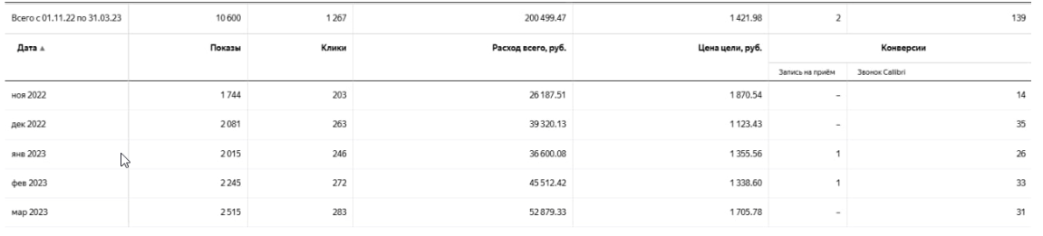 • Неврология — несмотря на то, что это не ключевое направление клиники, удалось получать лиды по цене 1 400–1 800 ₽.