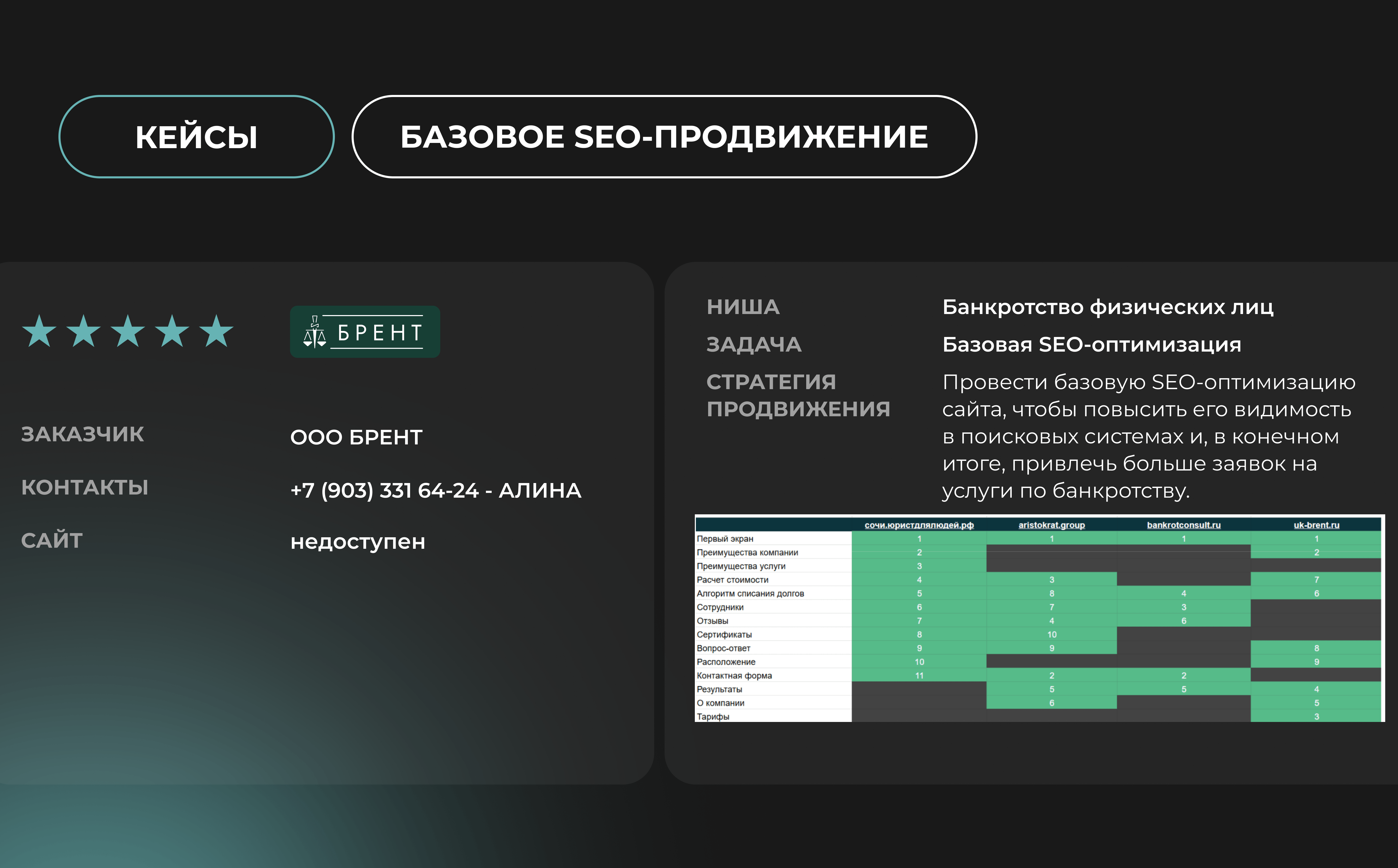 С компанией Брент мы сотрудничали более 3-х месяцев. После разработки сайта мы выполнили базовую SEO оптимизацию, которая помогла сайту продвинуться по поисковой выдаче.